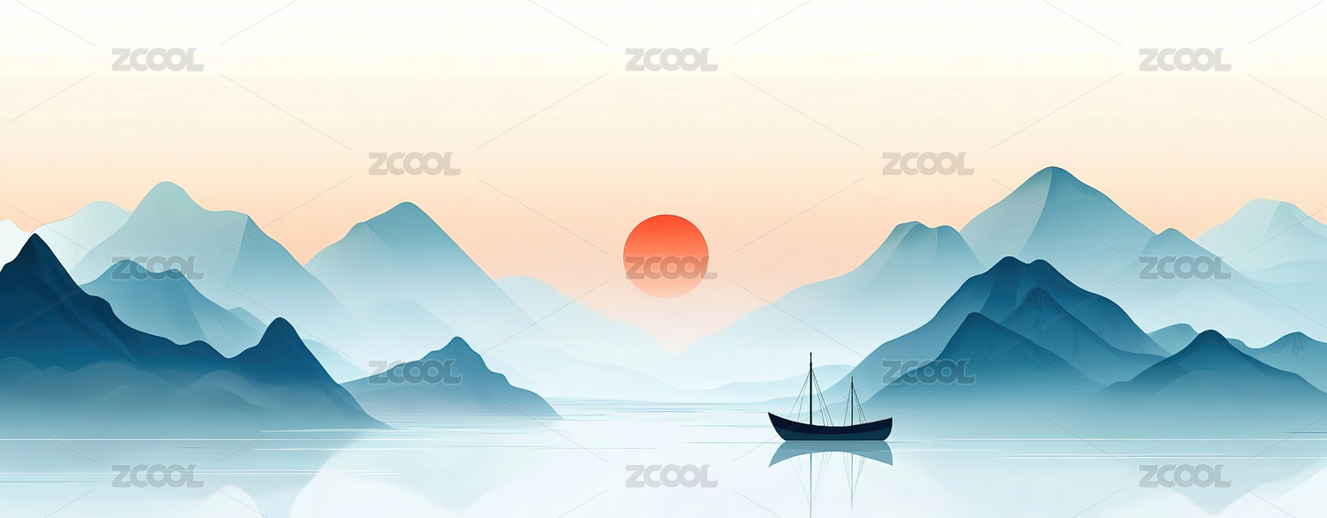 风光,插画,国风,扁平风,中国风,山,群山,黄昏,白昼,湖泊