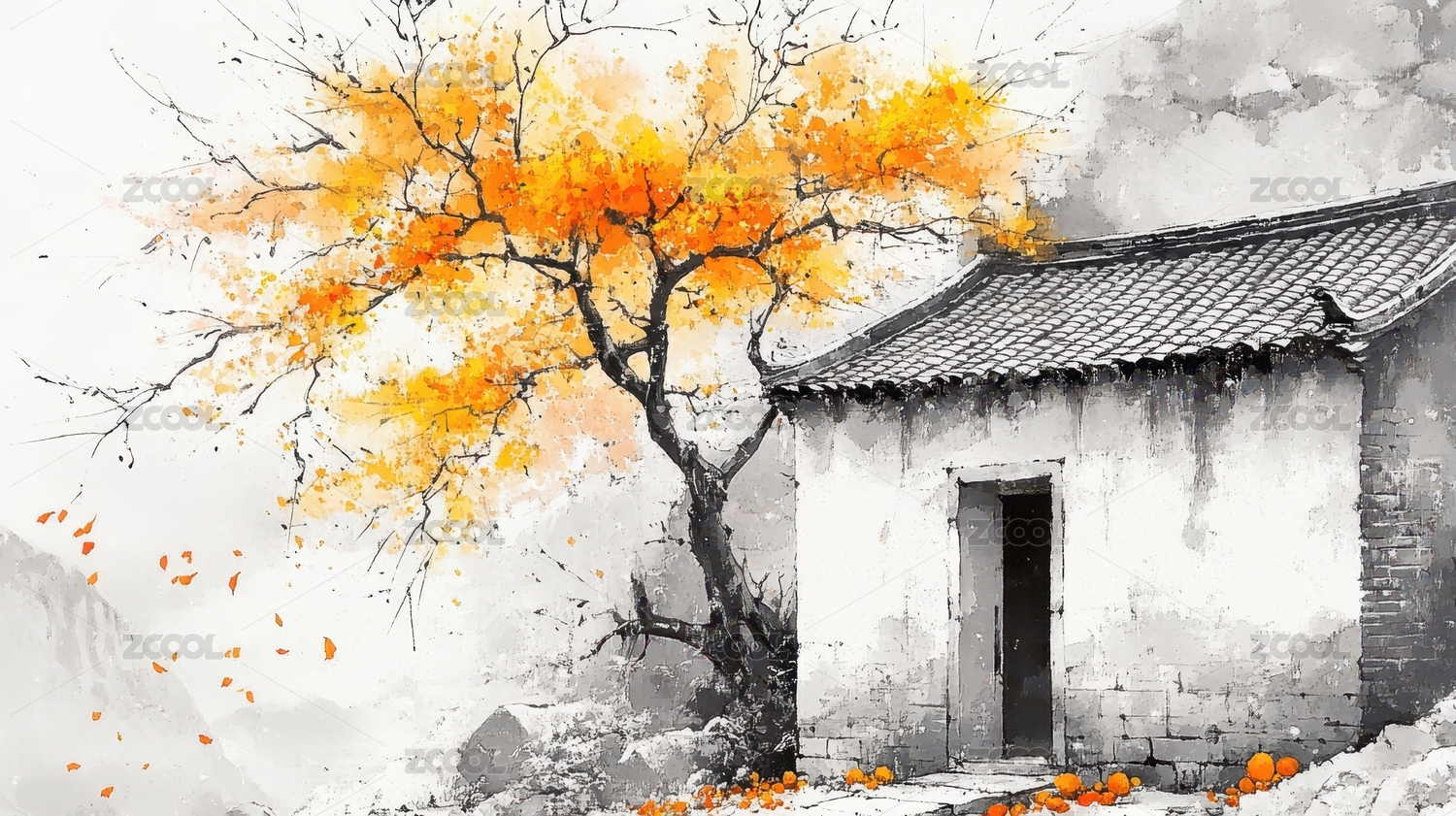 秋天中式建筑屋顶银杏树叶插画背景壁纸