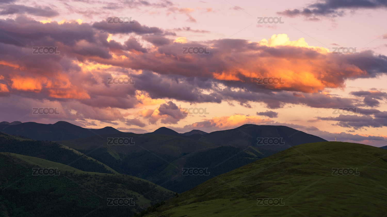 落日余晖洒在中国新疆伊犁阿克塔斯草原上