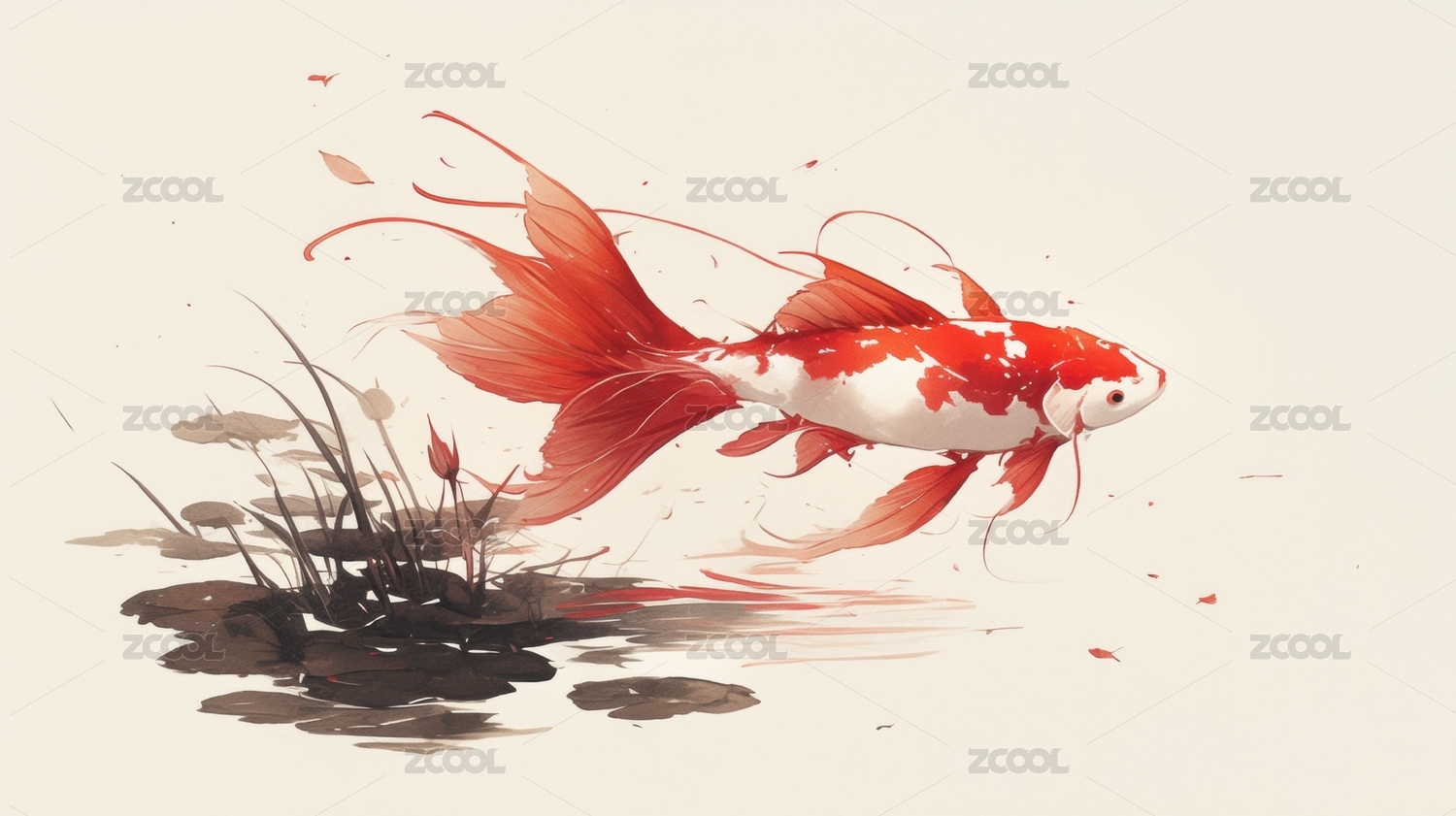 锦鲤跃动水墨画风