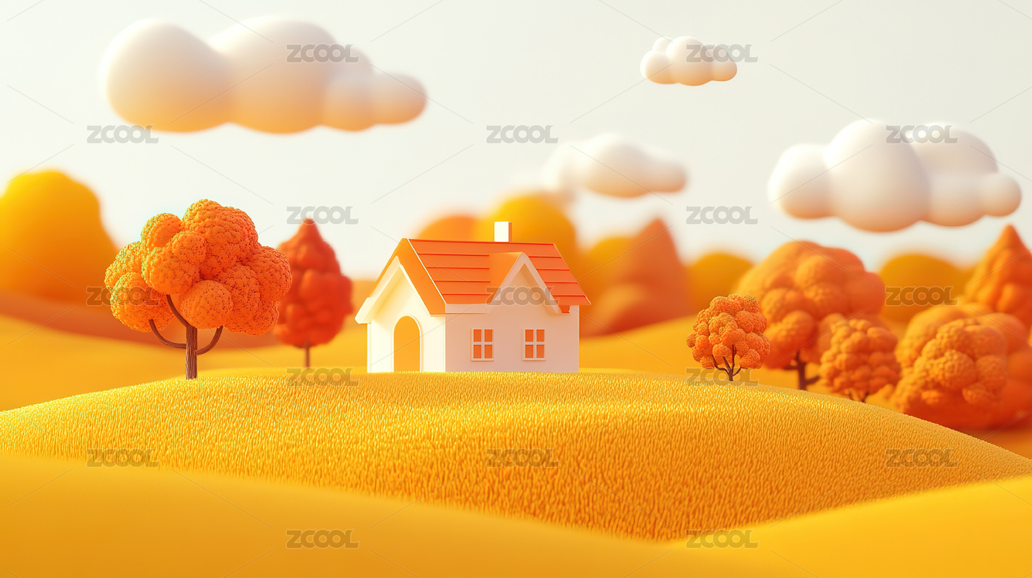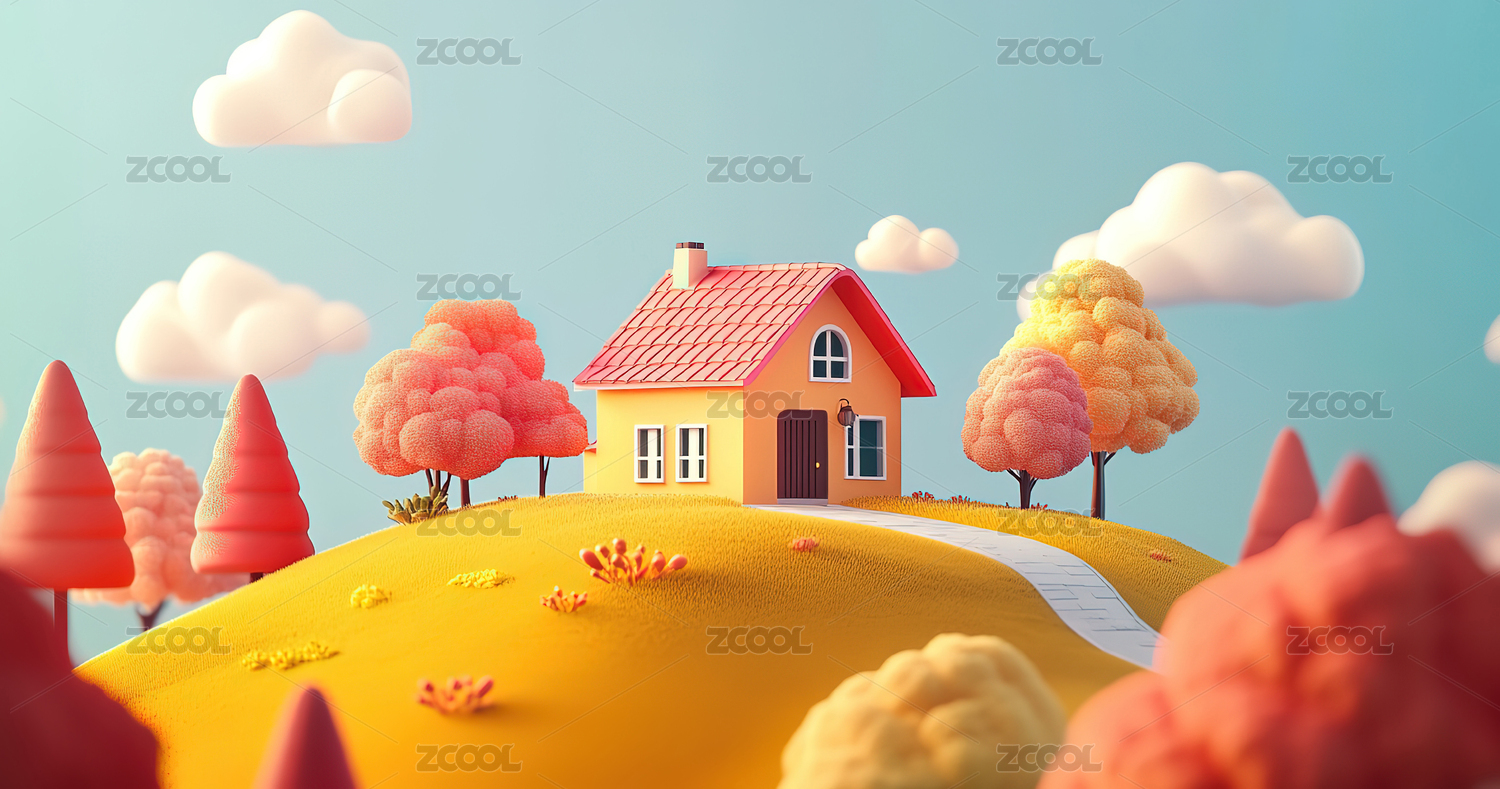 秋天白天山坡上树旁的木屋3D卡通立体插画
