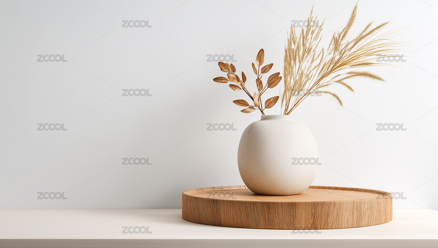 白墙前木质圆台上白瓶插着干枯草穗