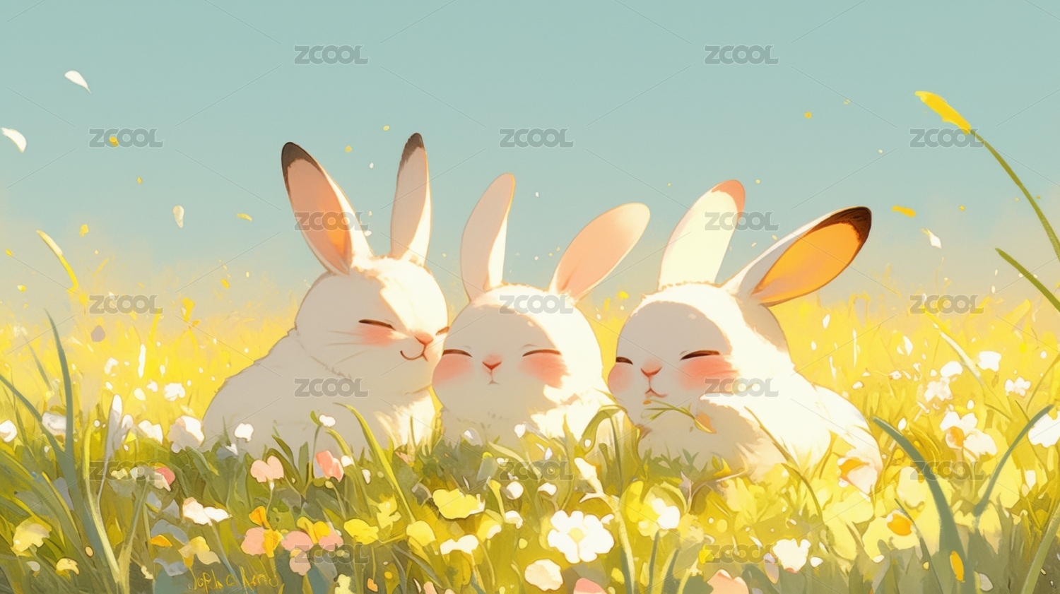三只兔子在花丛中沐浴阳光