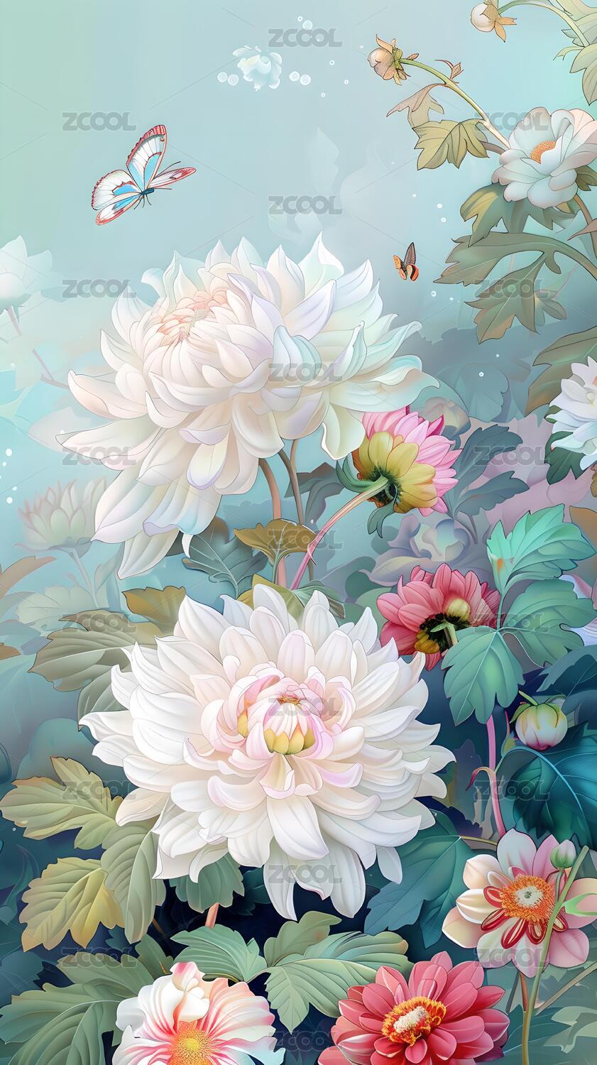 复古菊花植物图案插画海报背景