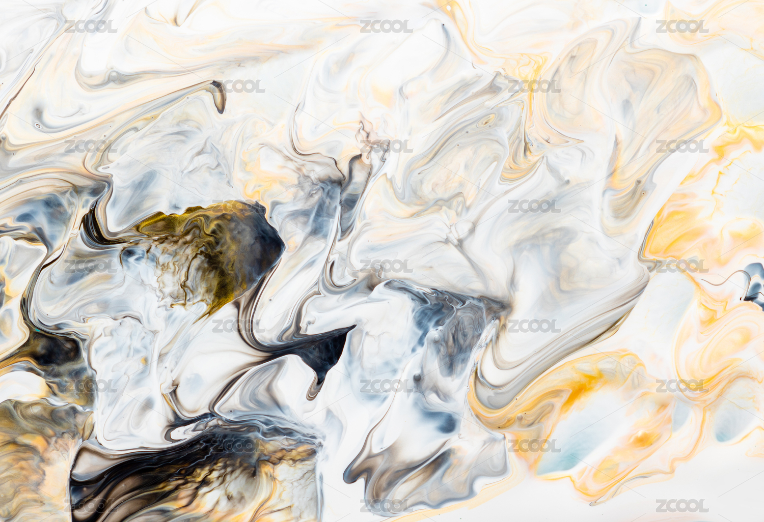 黑白黄混合颜料流体艺术,抽象的彩色背景墙纸纹理。