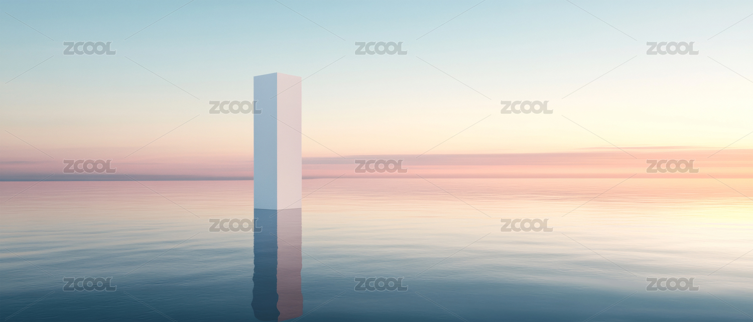 宁静海面上超现实主义的白色石碑