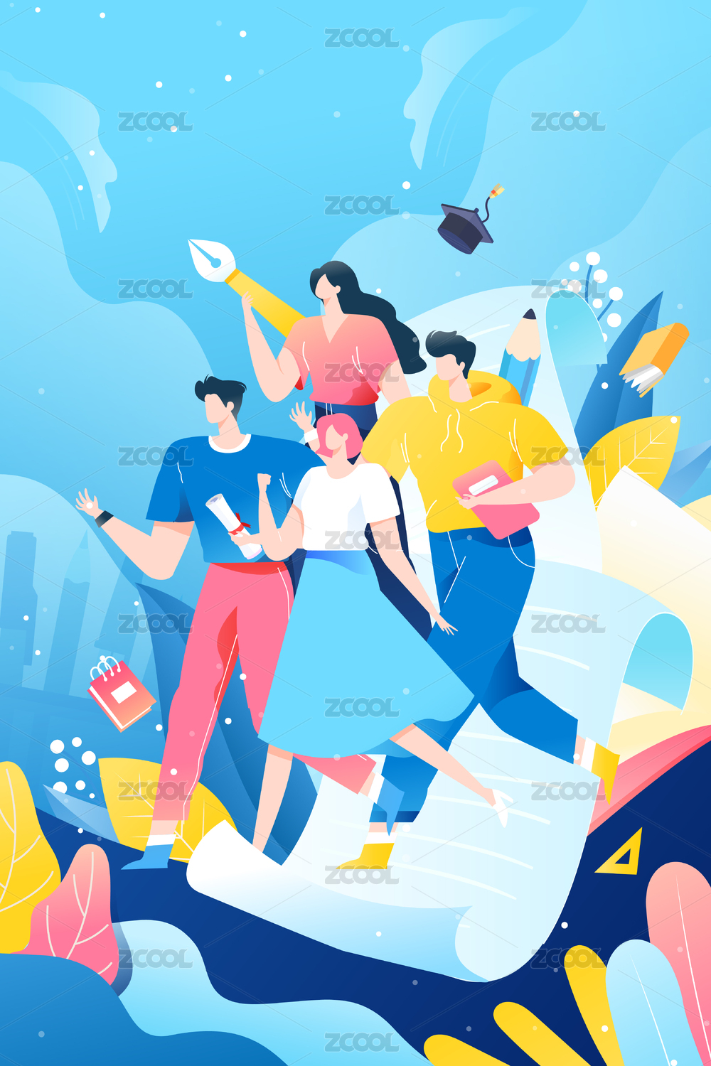 五四青年节朋友聚会年轻人高考毕业团队插画