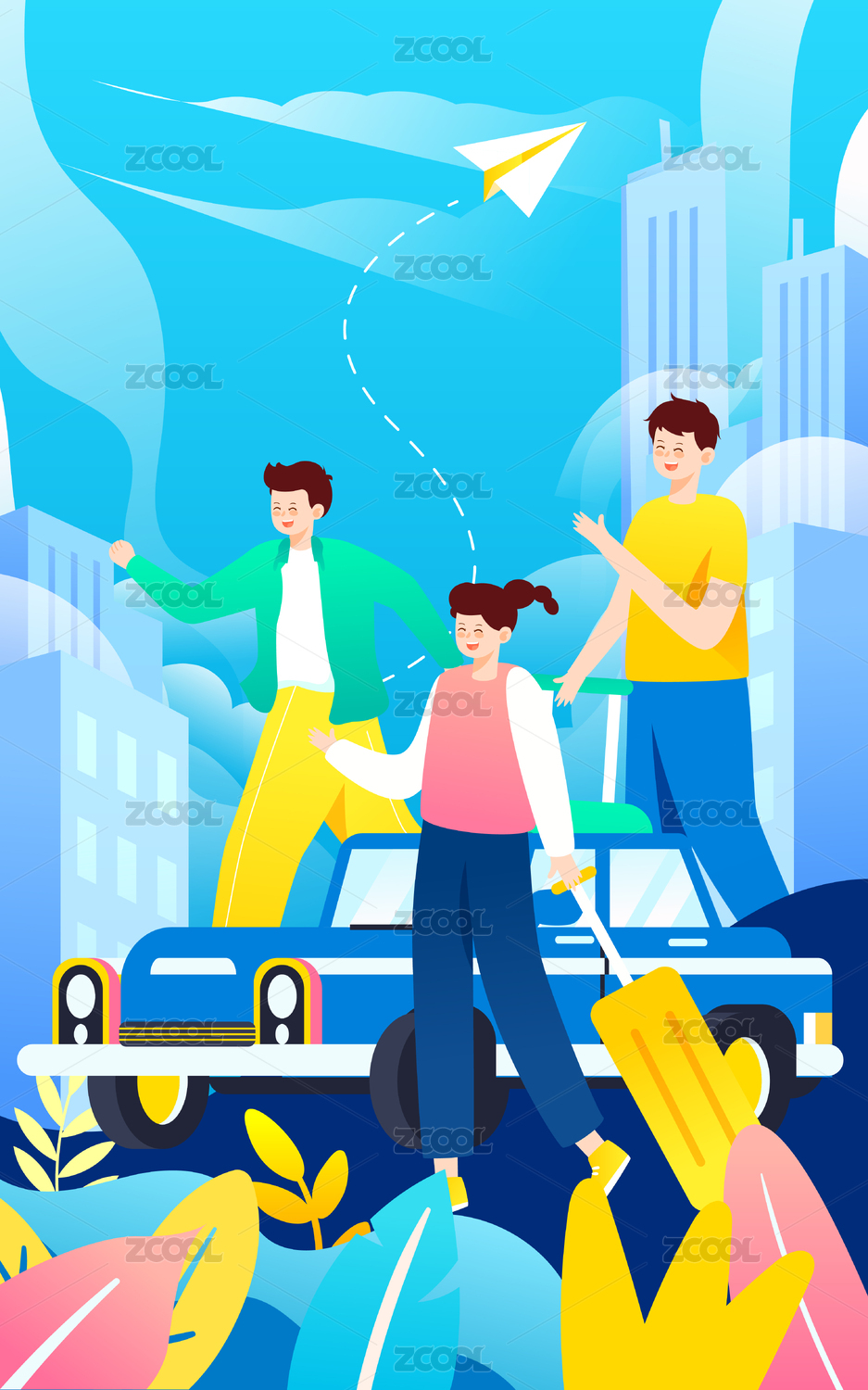 年轻男孩女孩开心旅行插画竖图