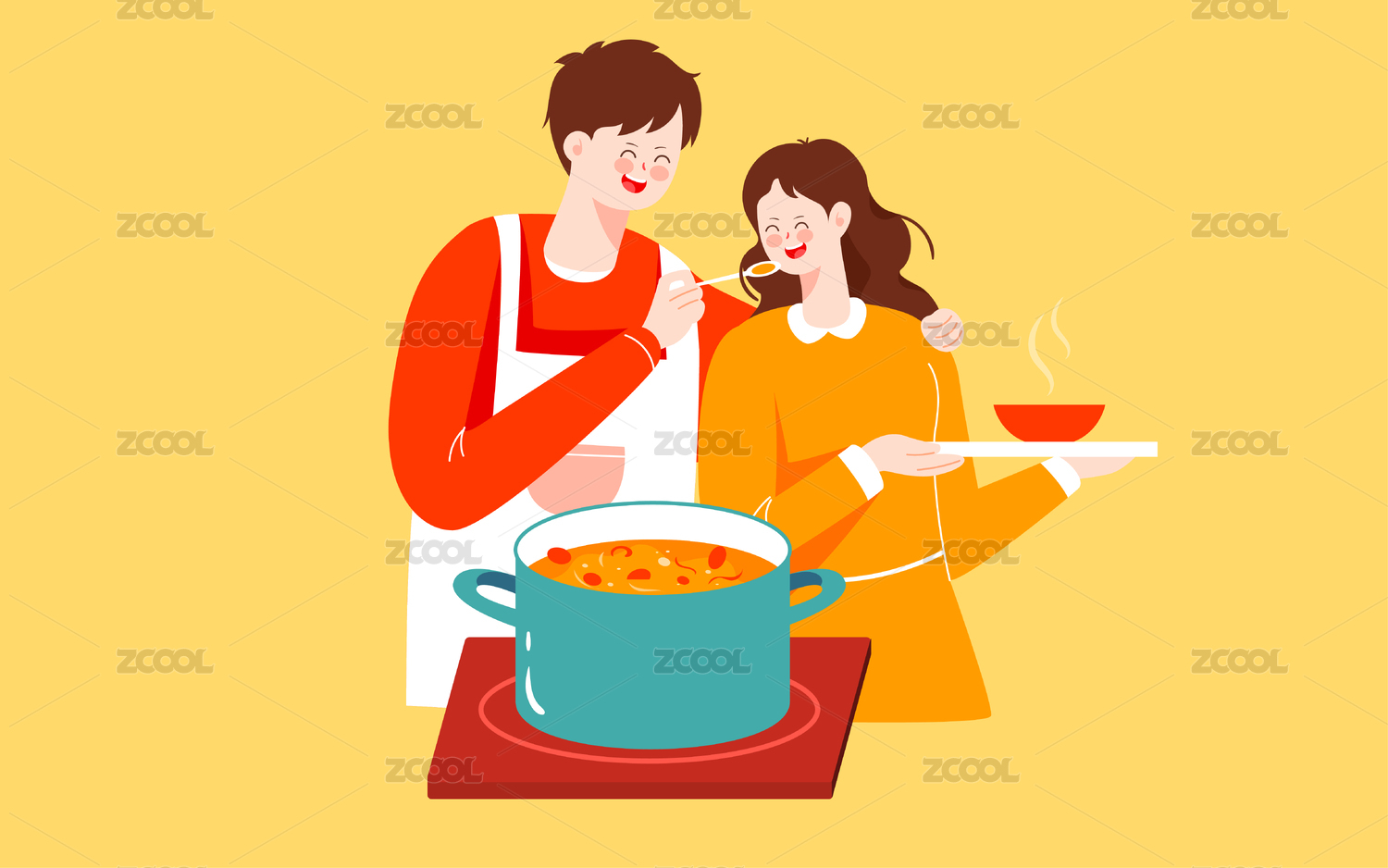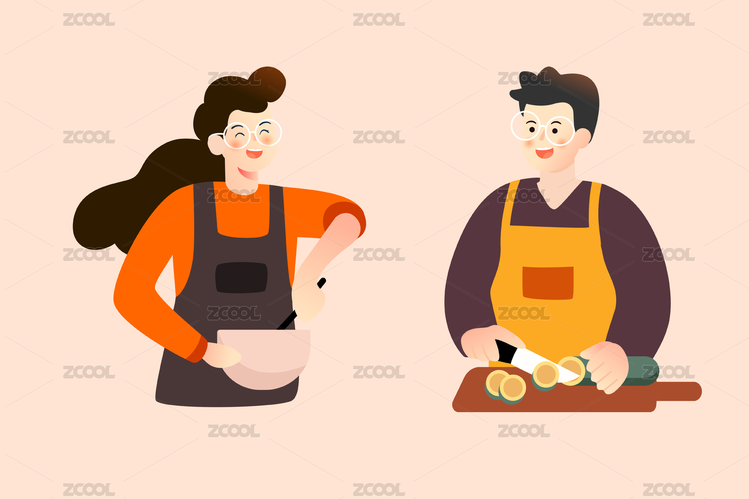 情侣厨房一起做饭烹饪美食健康餐饮饮食插画