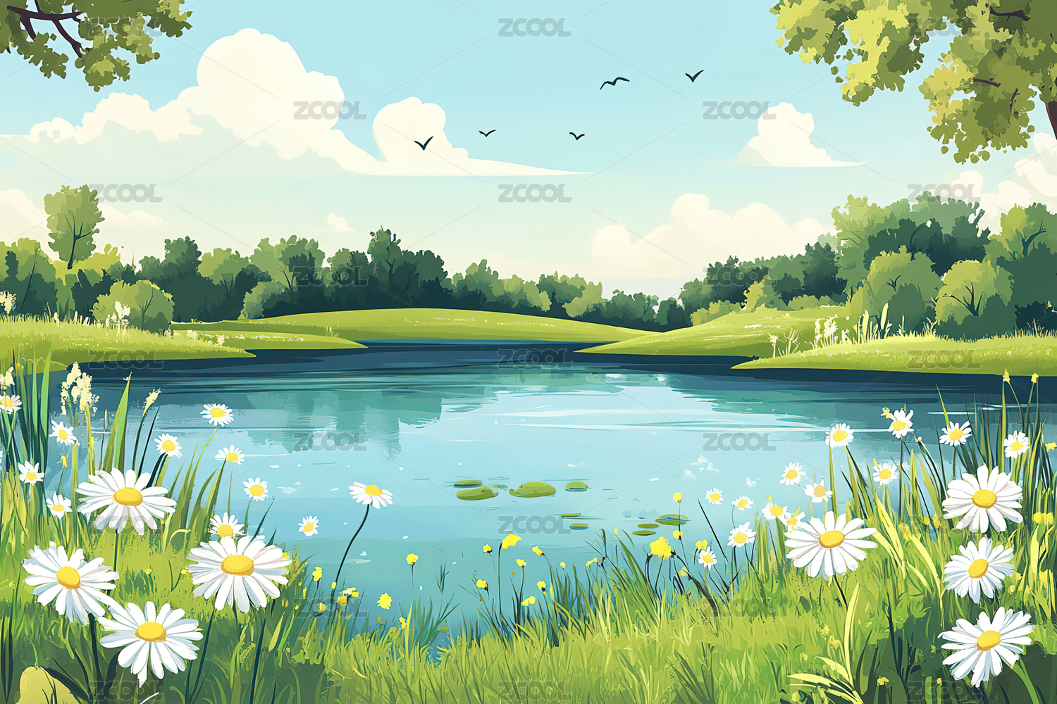 蓝天白云绿草花丛小河清新插画