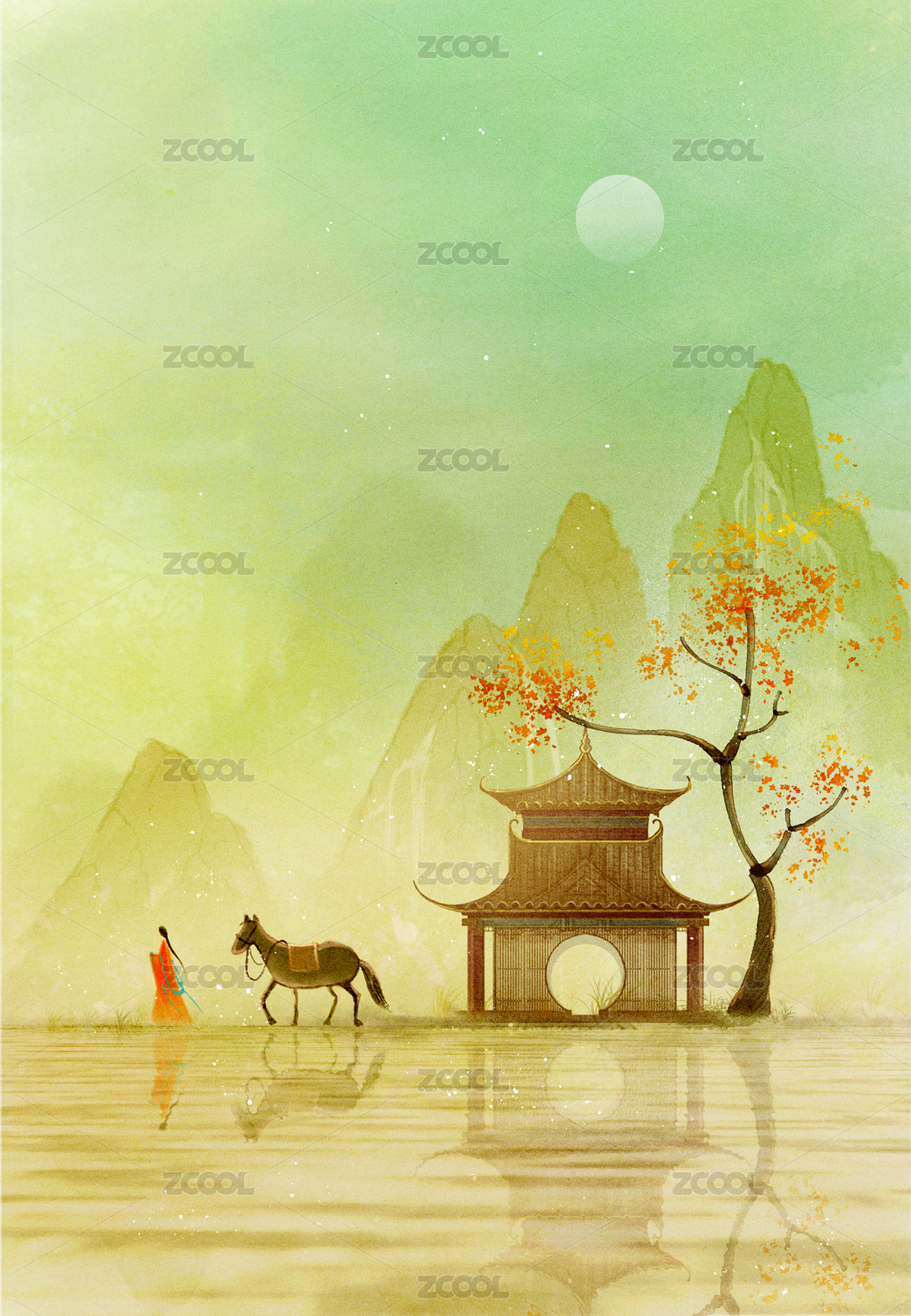 中国风美女山水海报插画