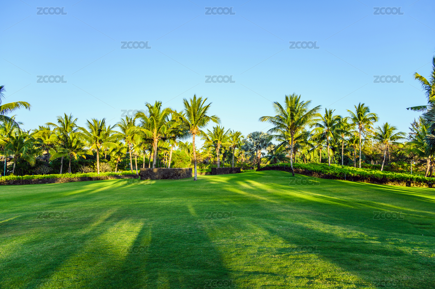 中国广东深圳深圳湾草坪椰树蓝天白云海边
