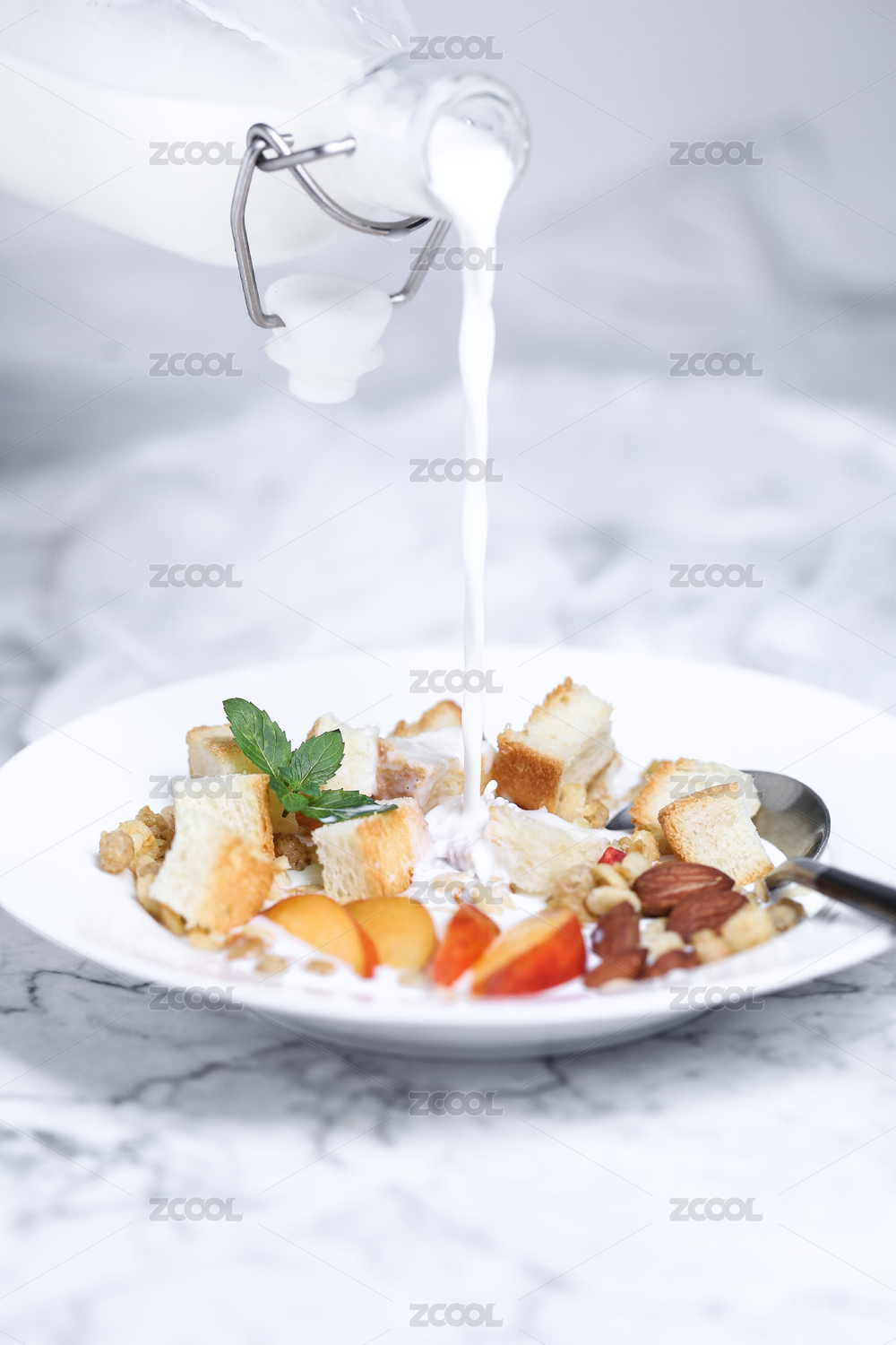 面包,烘烤,烘培,坚果,牛奶,水果,桃子,黄桃,盘子,玻璃