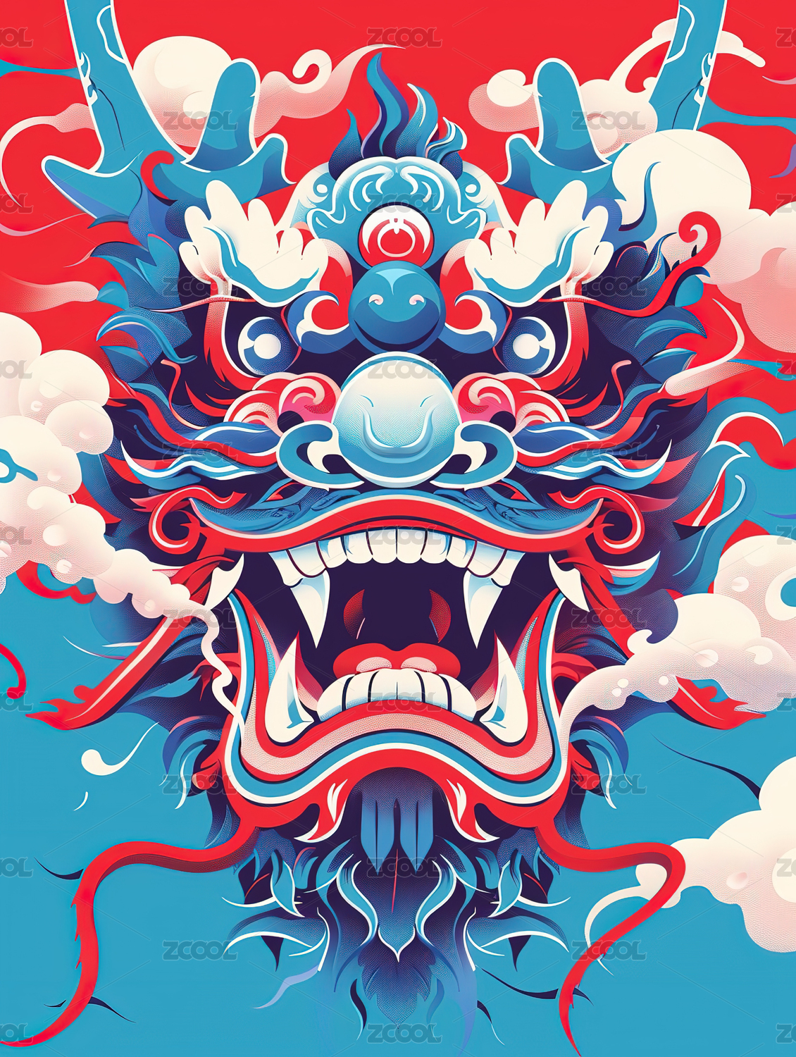 国风插画 神话怪兽龙头特写