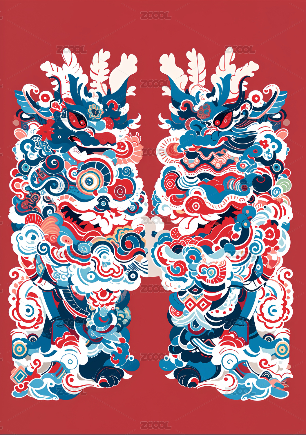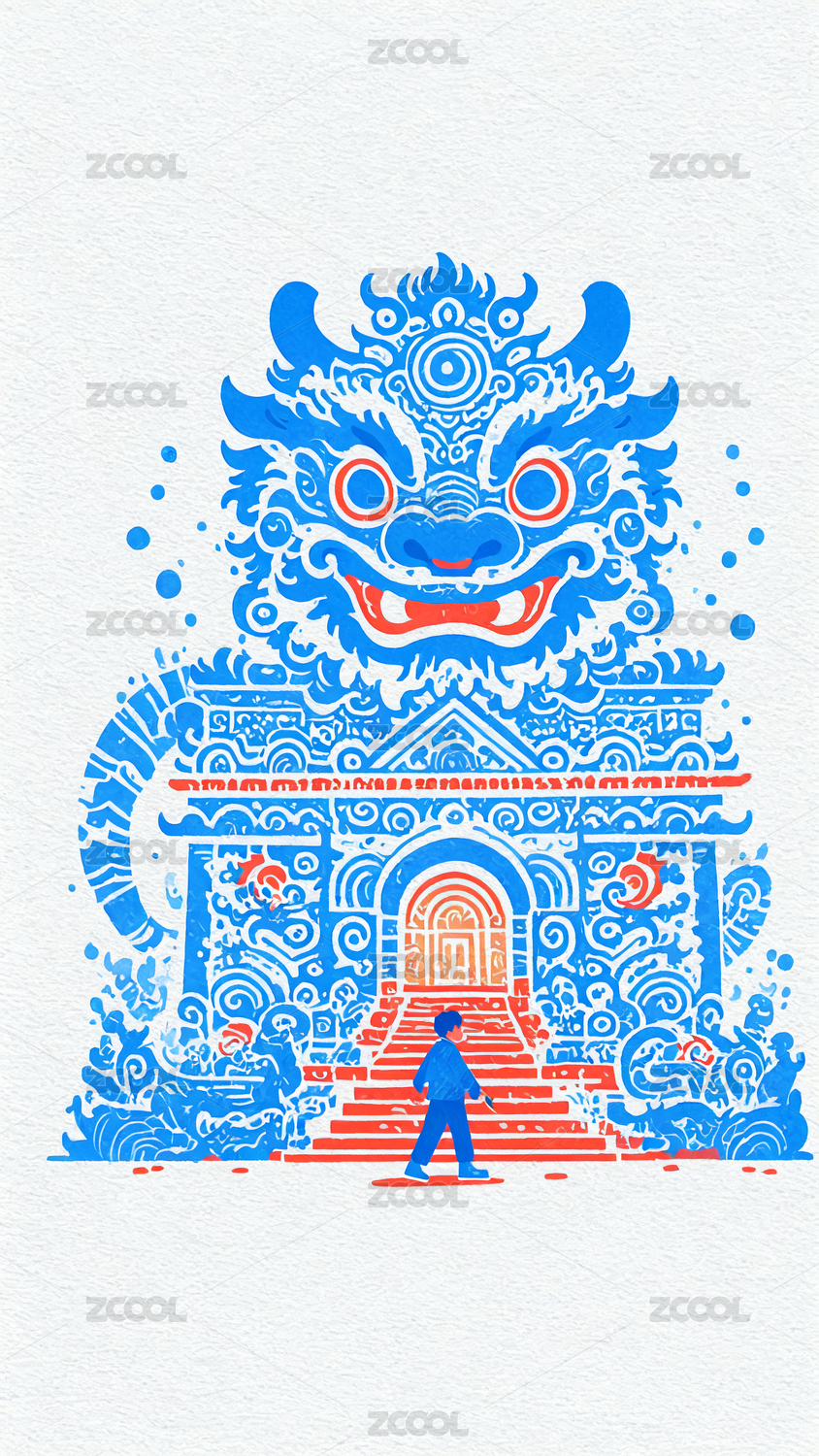 醒狮复古花纹插画