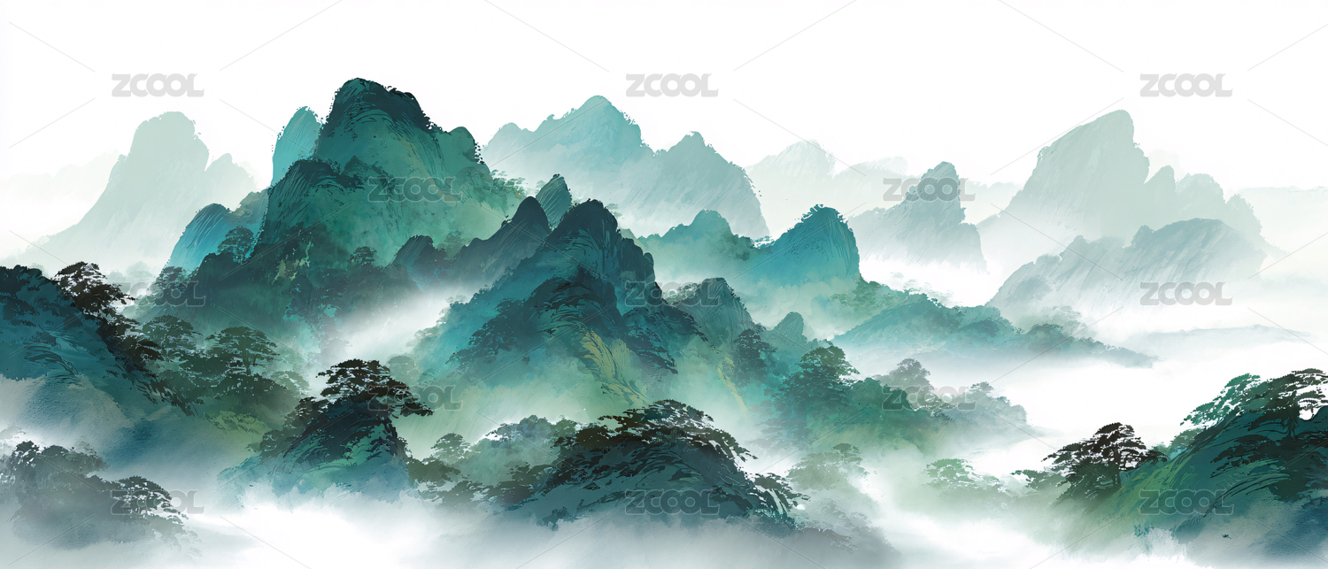 中国水墨画风格的山峰在云雾中若隐若现,展
