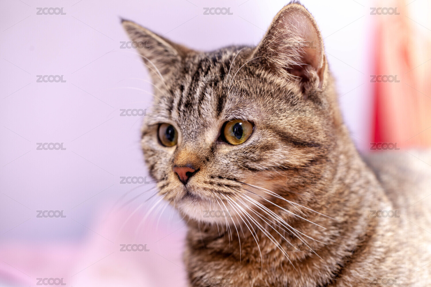 一只浅色花纹短毛猫睁着圆溜溜的大眼睛