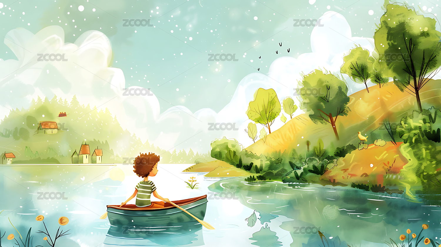 秋天女孩在湖边玩耍手绘插画