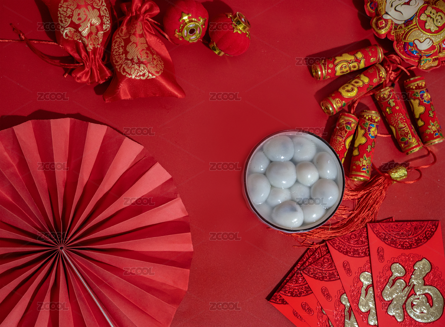元宵节美食汤圆摆放在古窗棂红色背景上