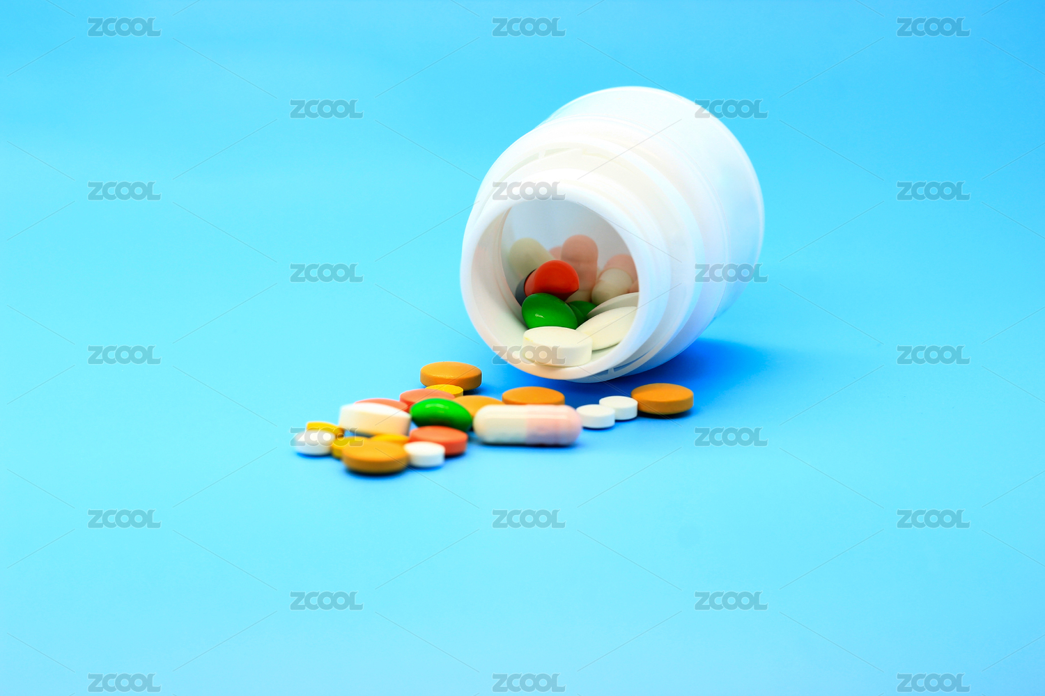 在蓝色背景上用于医疗治疗用中西药药丸胶囊