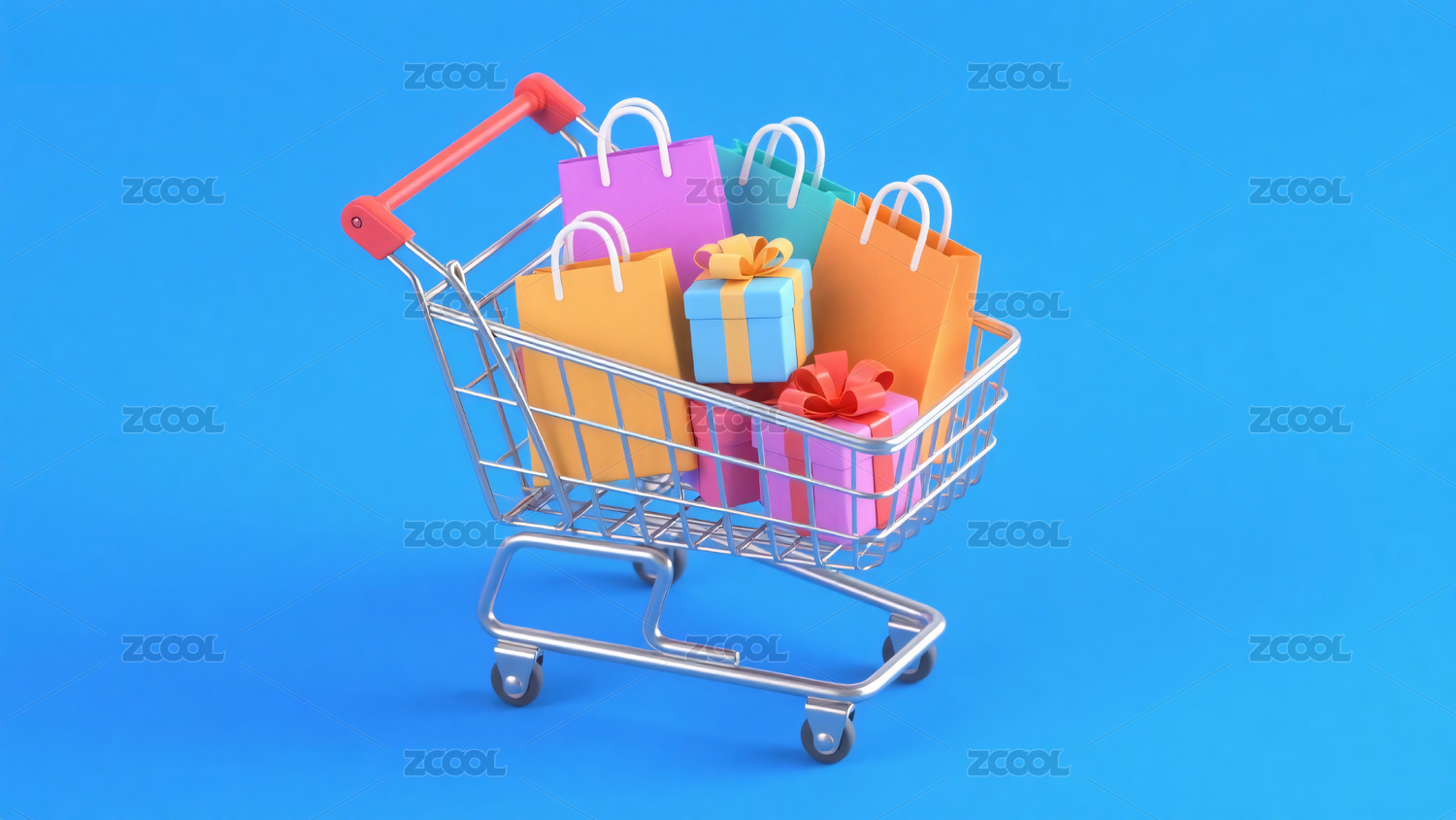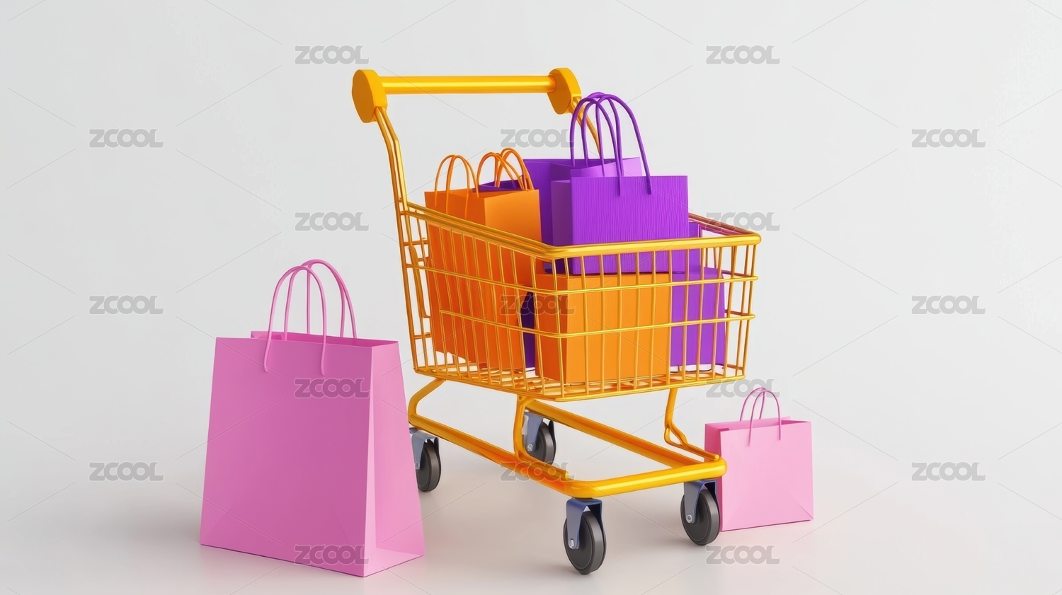 粉红色背景下购物车中彩色购物袋的特写镜头