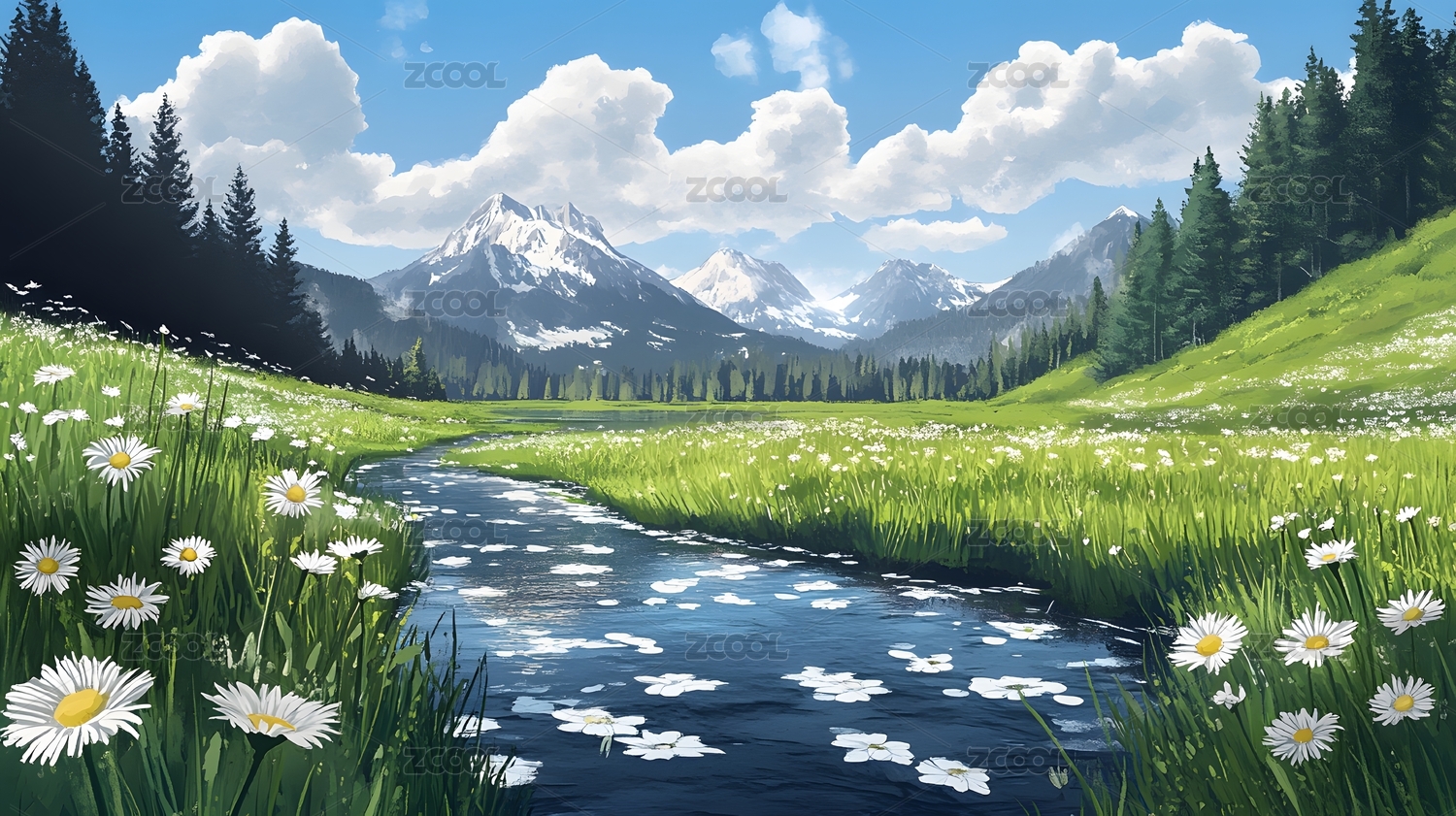 雪山溪流自然美景