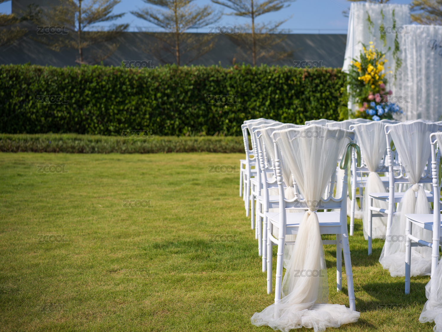 婚礼在户外阳光明媚的日子。重点是在椅子上。