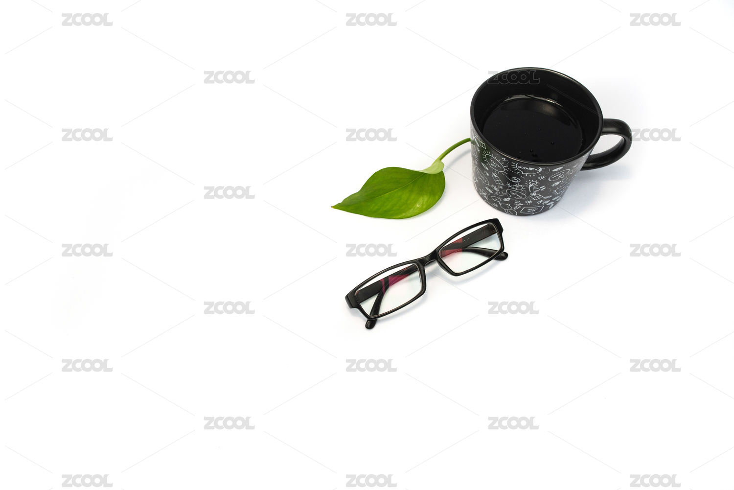 白色背景正上方视角特写手机咖啡眼镜和龟背竹