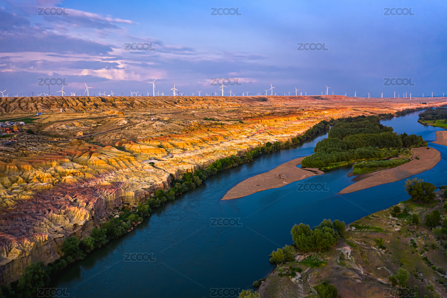 航拍傍晚光线下的中国新疆阿勒泰额尔齐斯河旁的五彩滩景区彩色丘陵