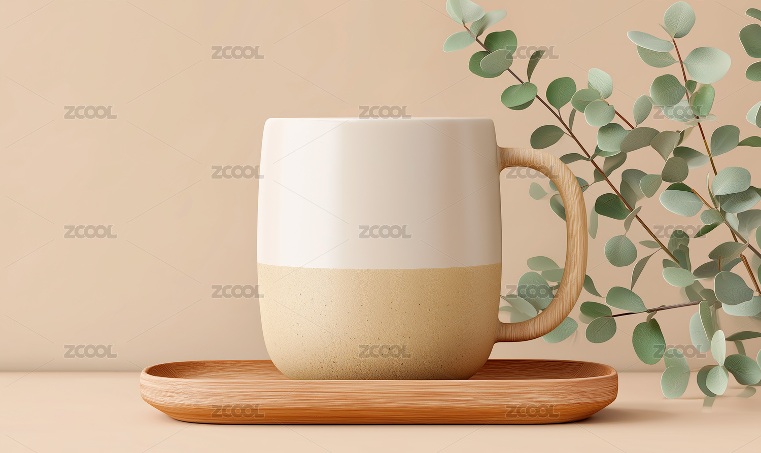 浅棕背景绿植旁带杯垫陶瓷杯静物场景
