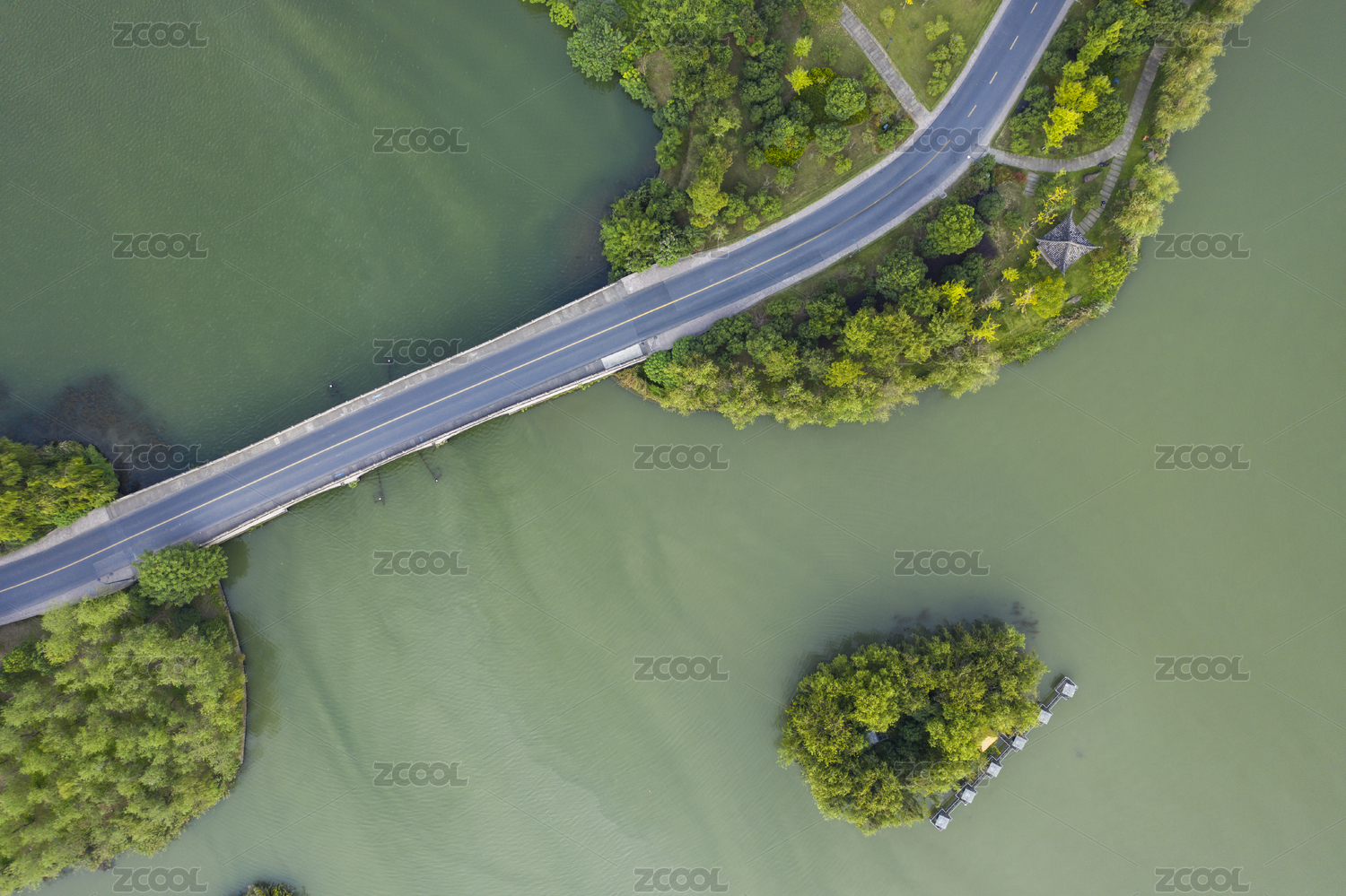 夏季白天正上方视角航拍徐州云龙湖湖上公路