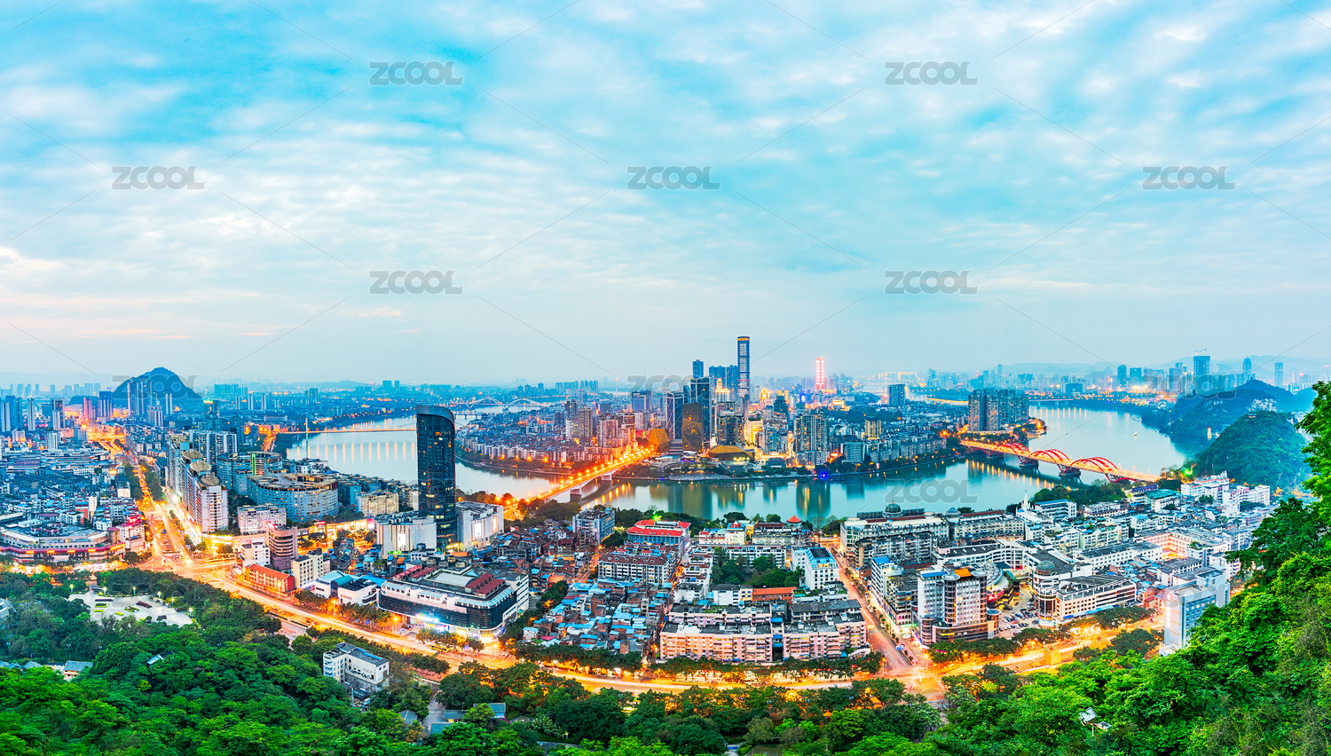 广西柳州市马鞍山傍晚时分的城市天际线风光