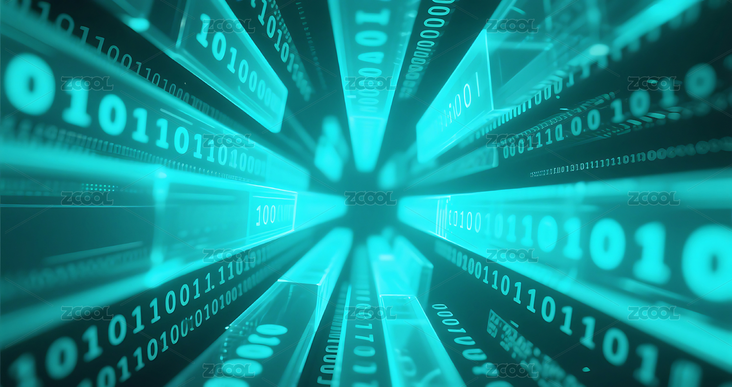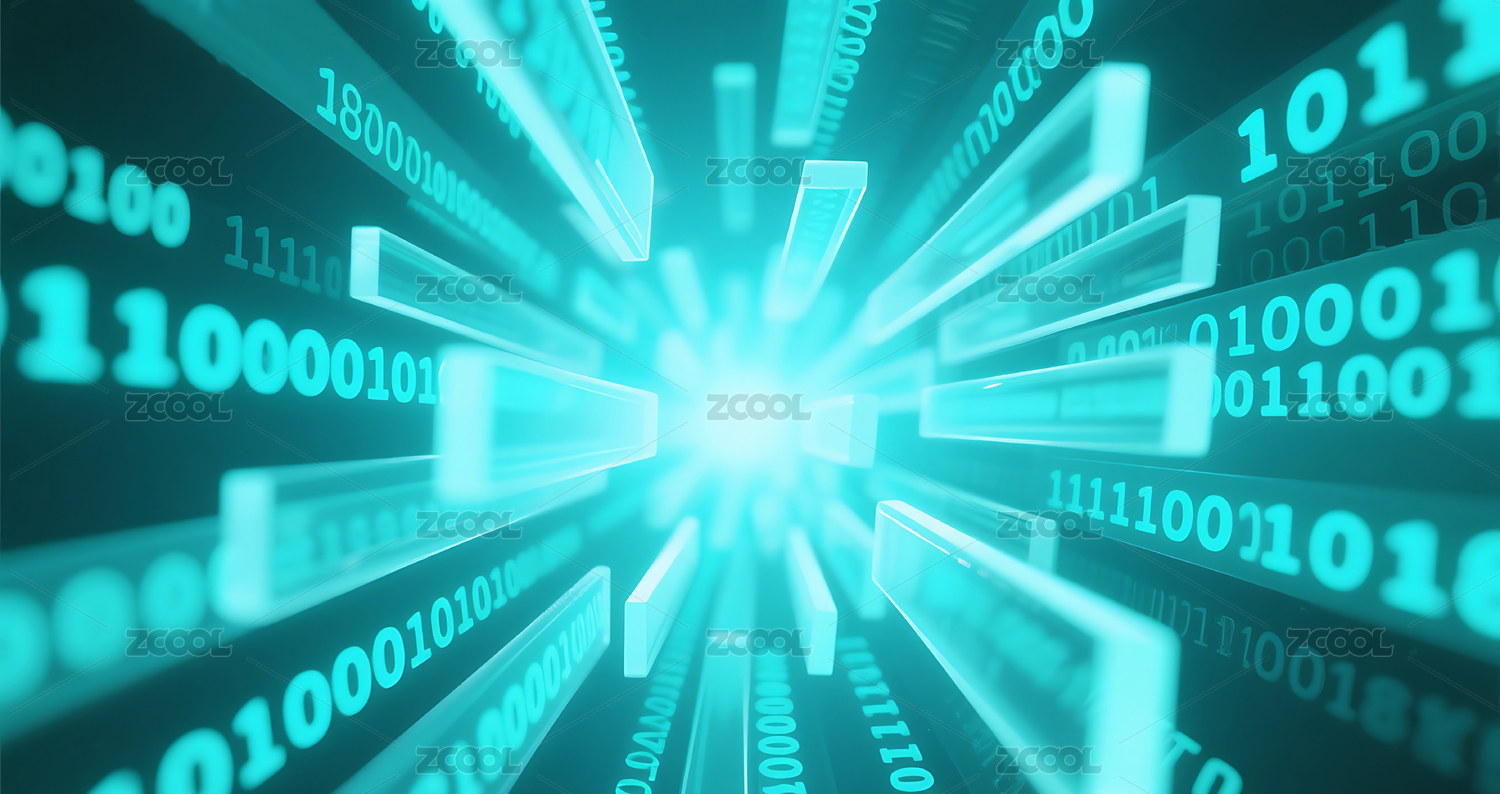 蓝绿色立体玻璃条块和代码向四周扩散背景
