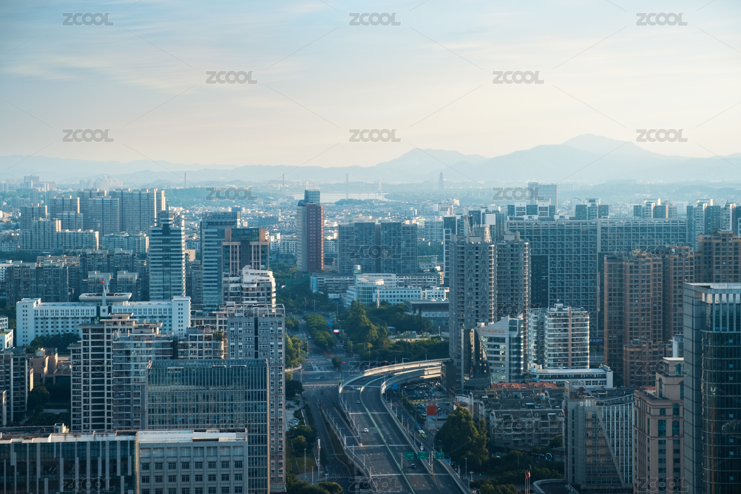 清晨朝阳下在北京海淀区百望山上拍摄的中关村软件园二期城市建筑景观