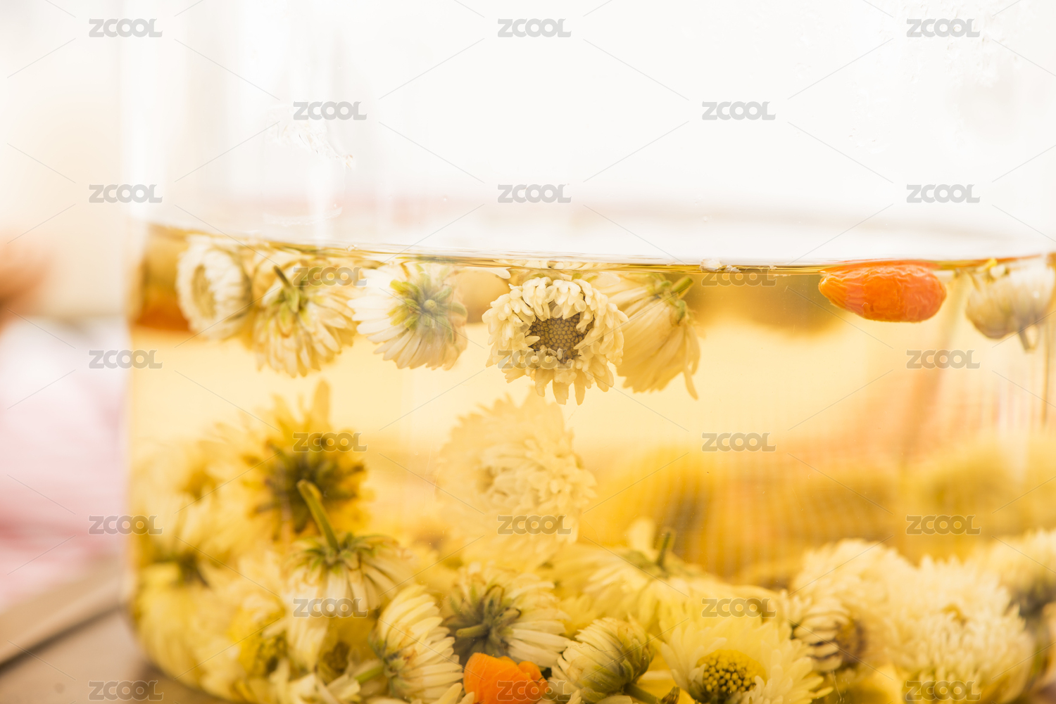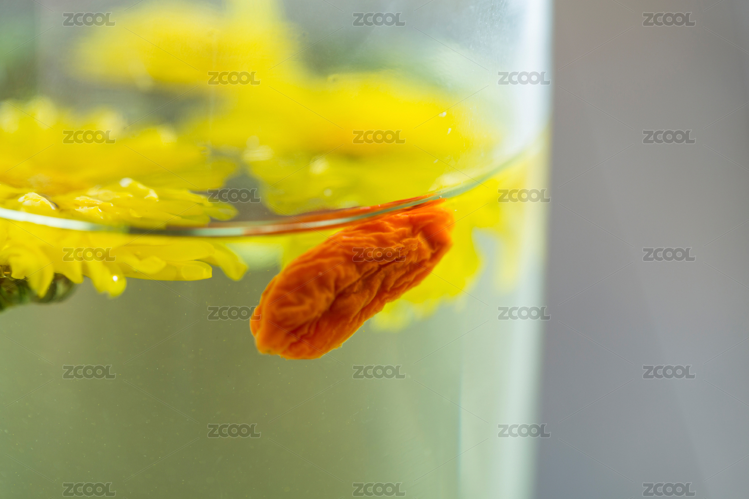 透明玻璃杯中的枸杞菊花茶饮品