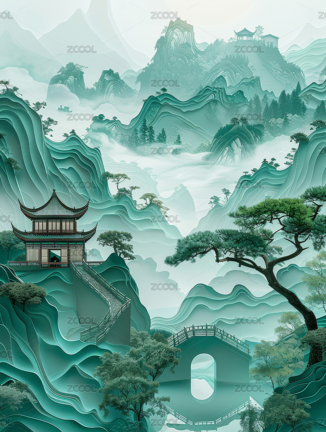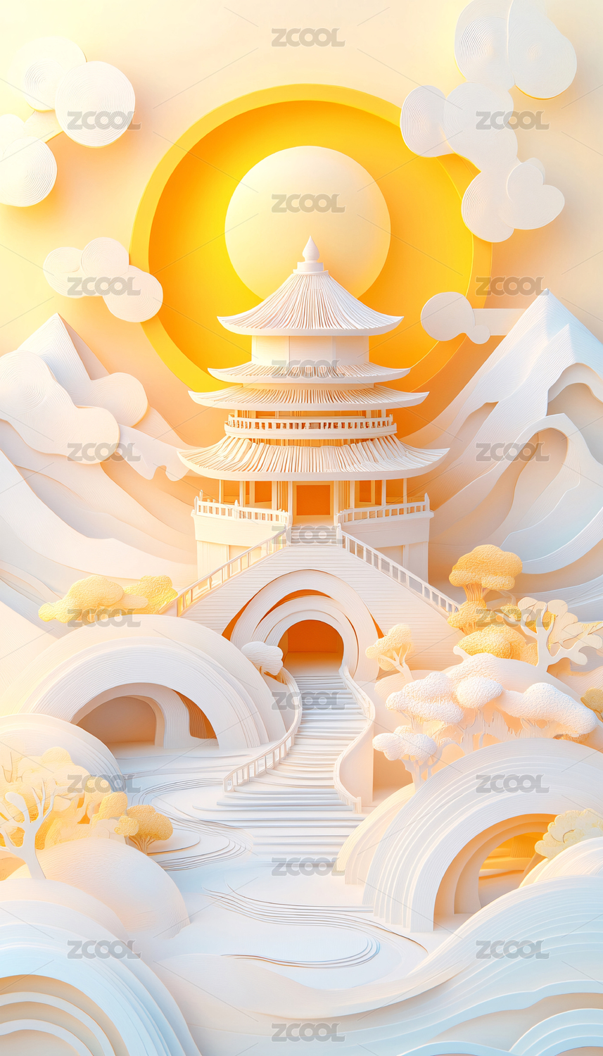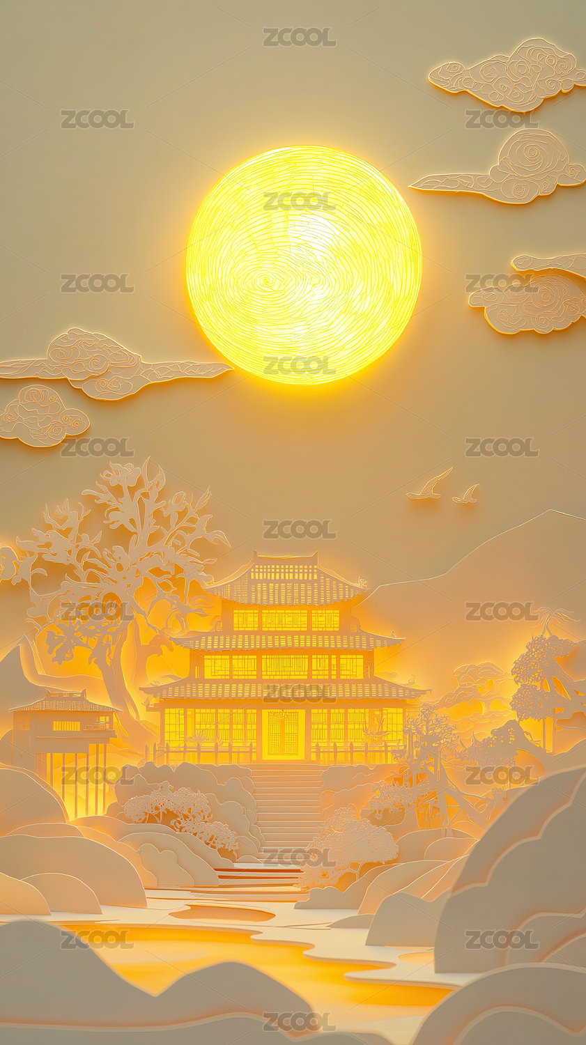 中国风古楼建筑传统国风古建筑国潮插画背景