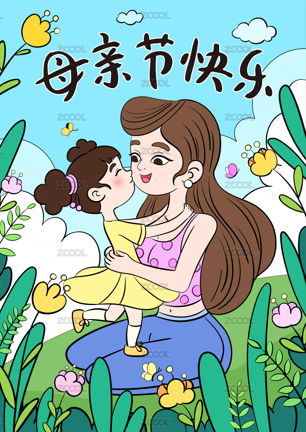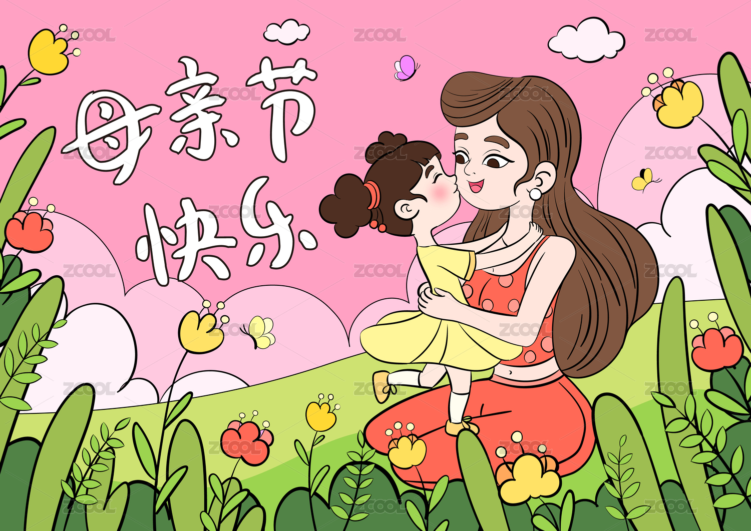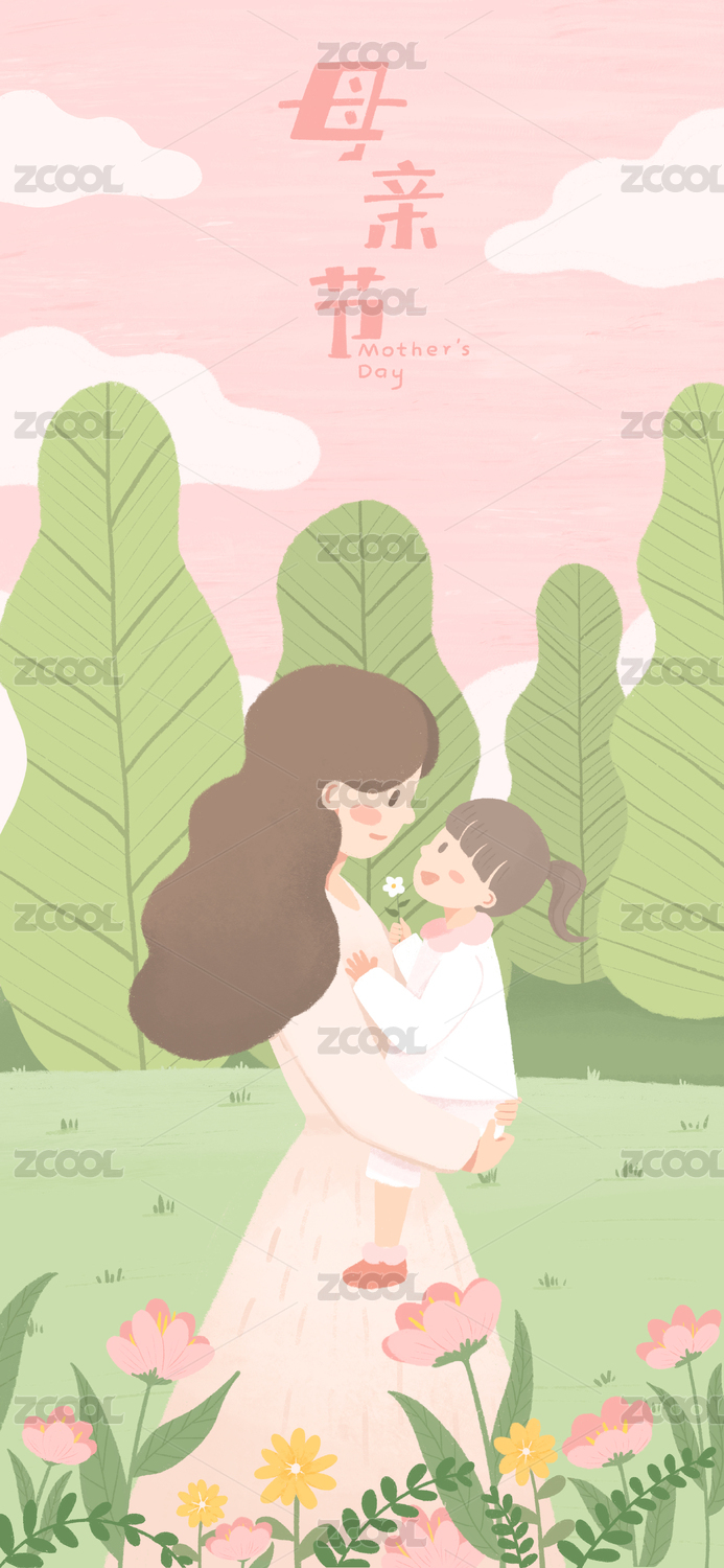 母亲节,女孩,树木,花朵,树丛,玩游戏,亲子活动,儿童,插画,公园