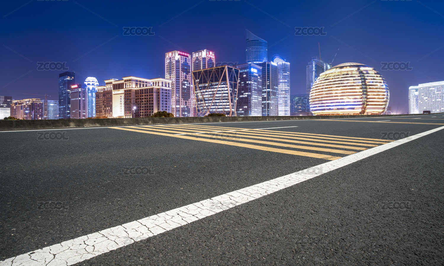 前景为空的道路地面和杭州城市建筑景观天际线夜景