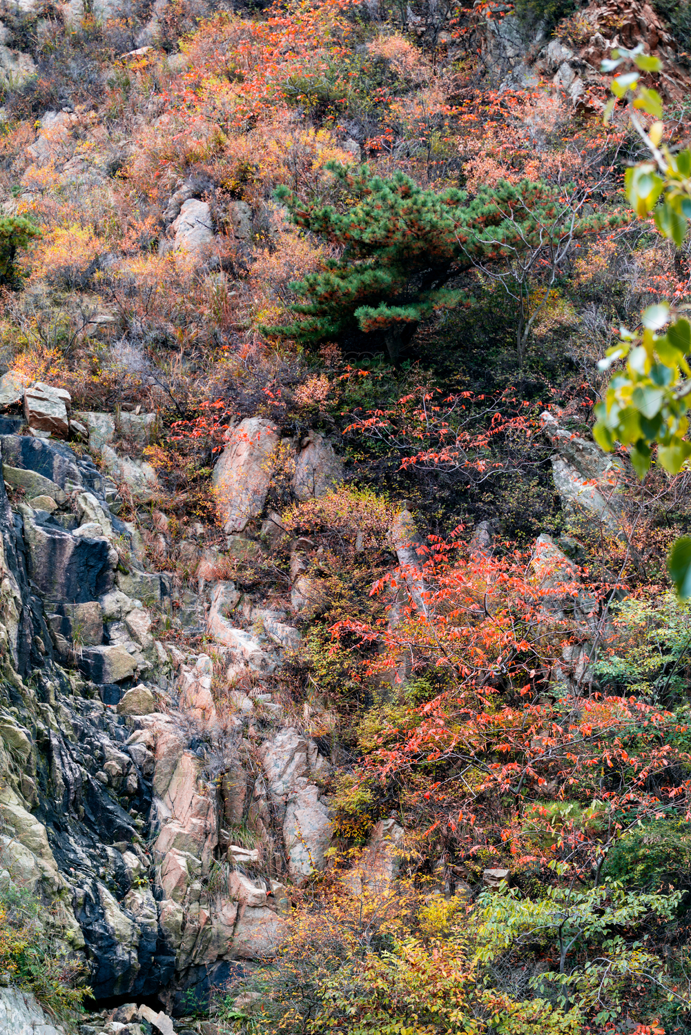 中国江苏连云港云龙涧景区攀爬在岩石上的五彩秋叶