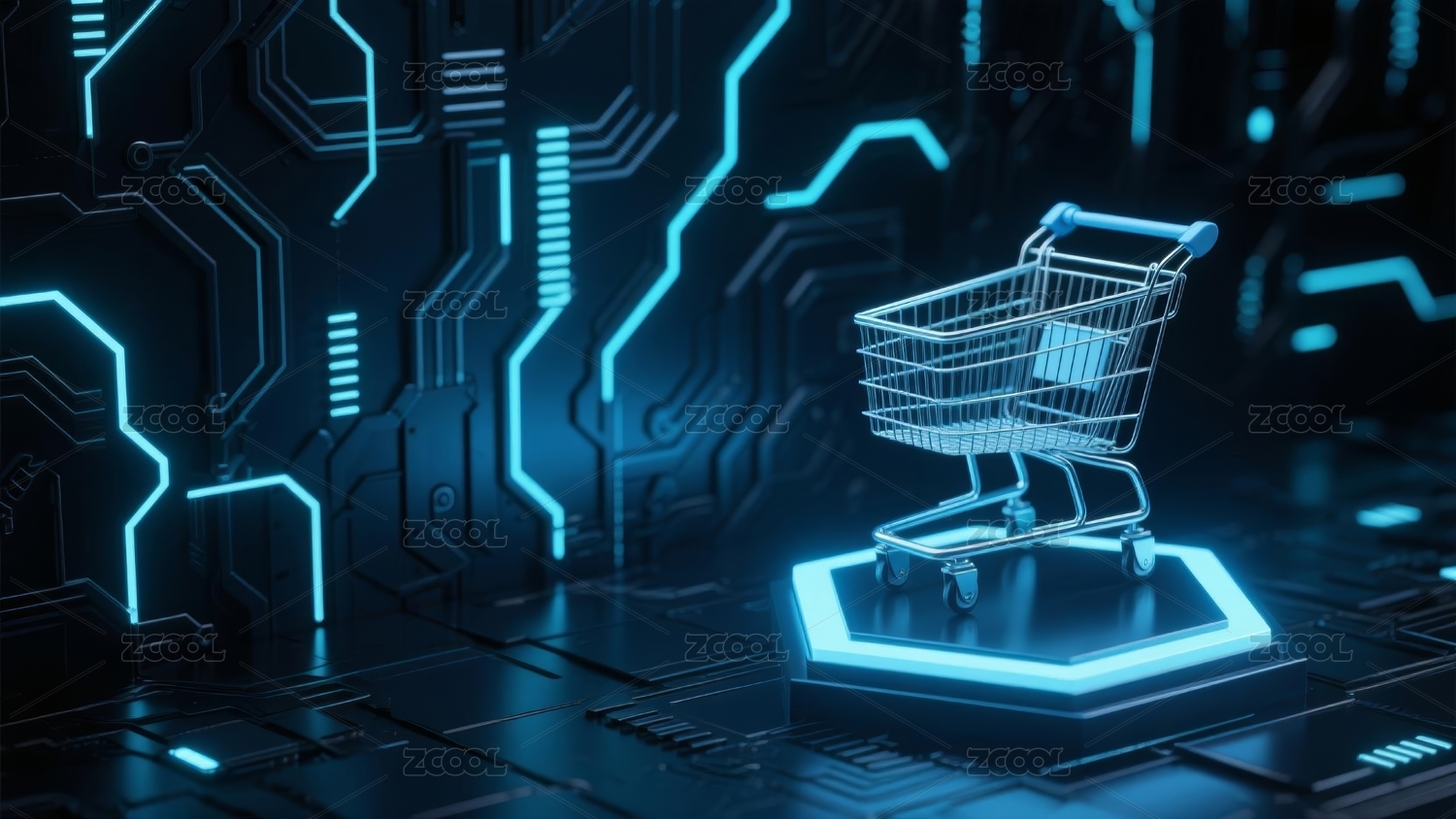 蓝色购物车配未来电路板背景