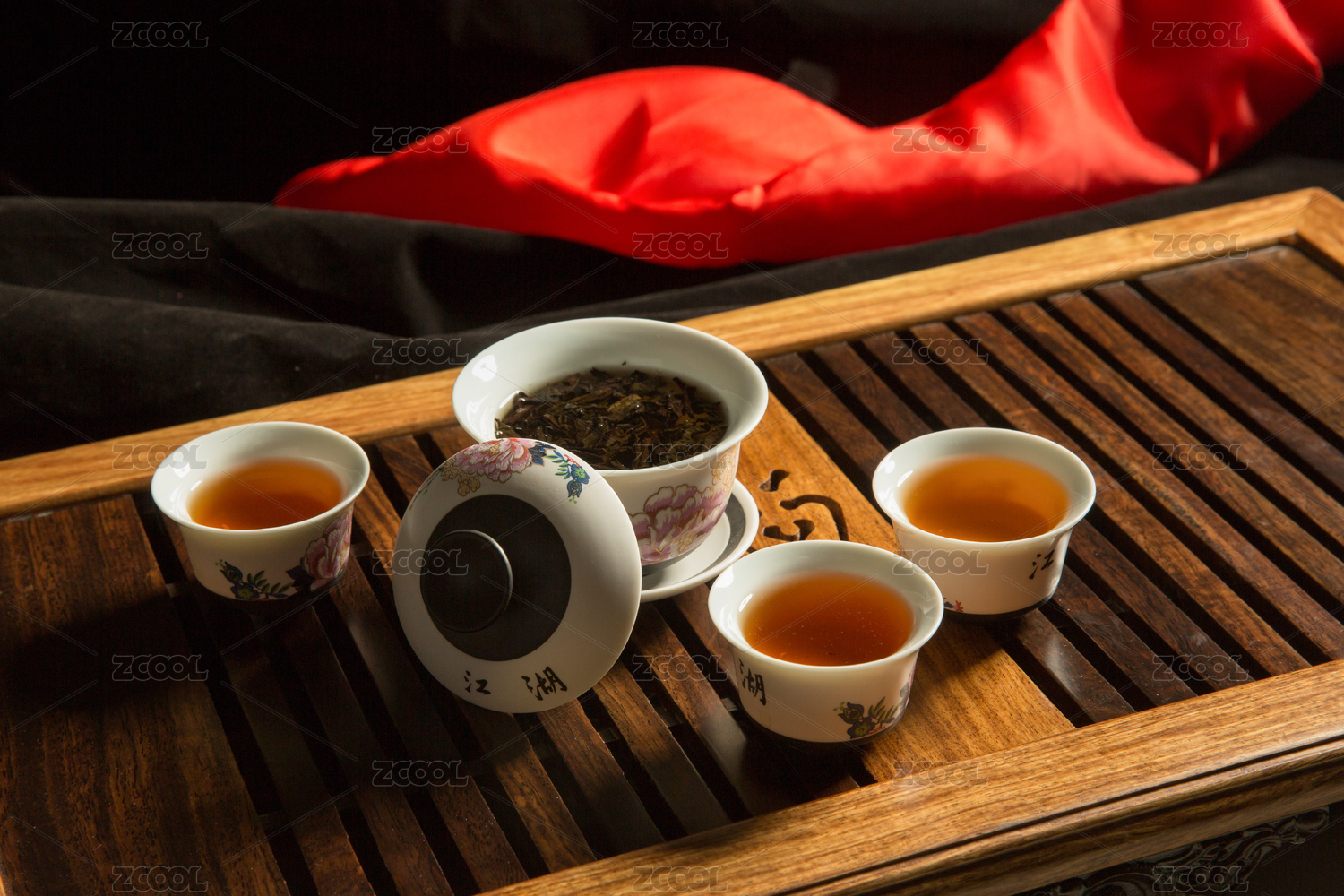 室内桌上茶盘里的红茶茶汤茶碗