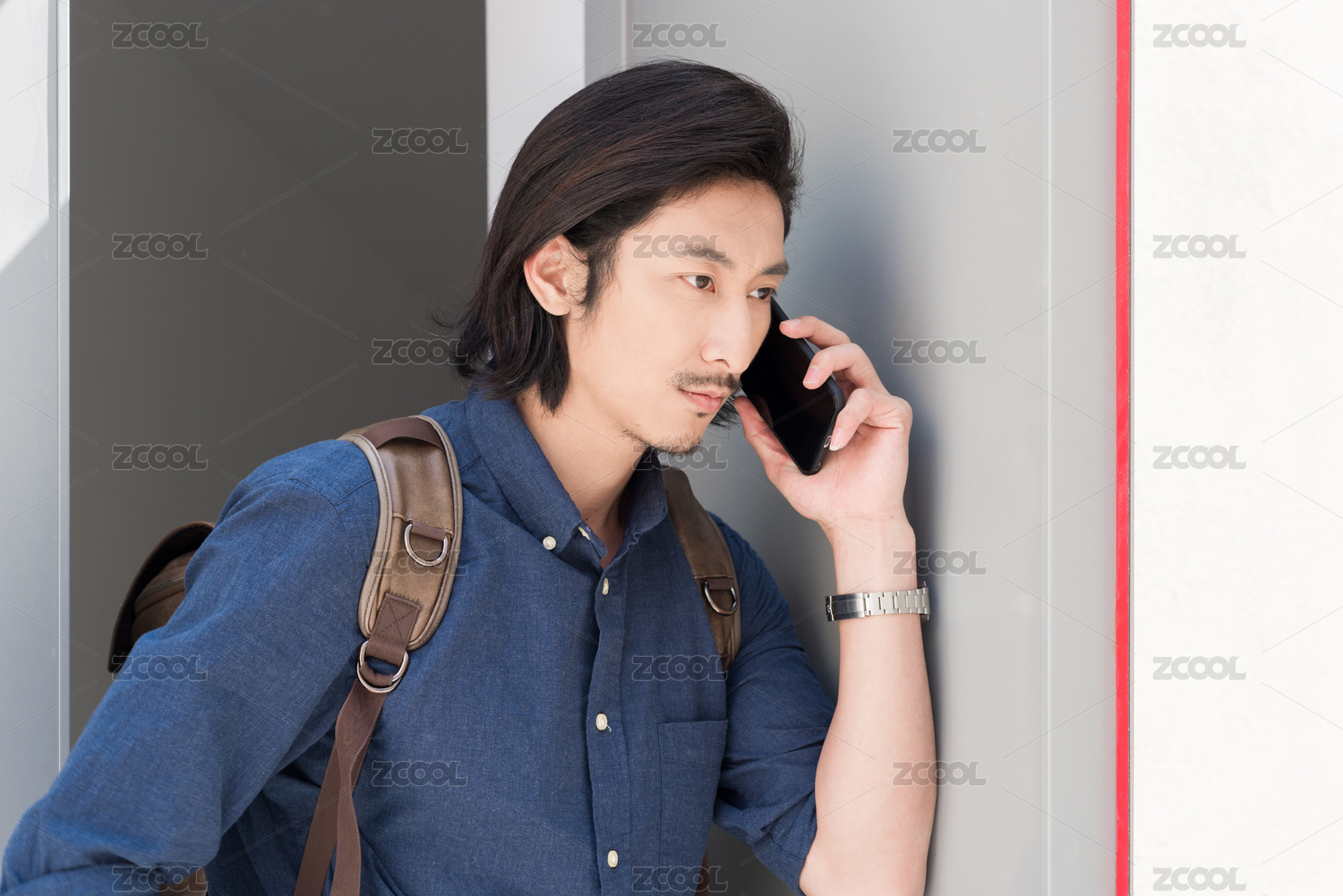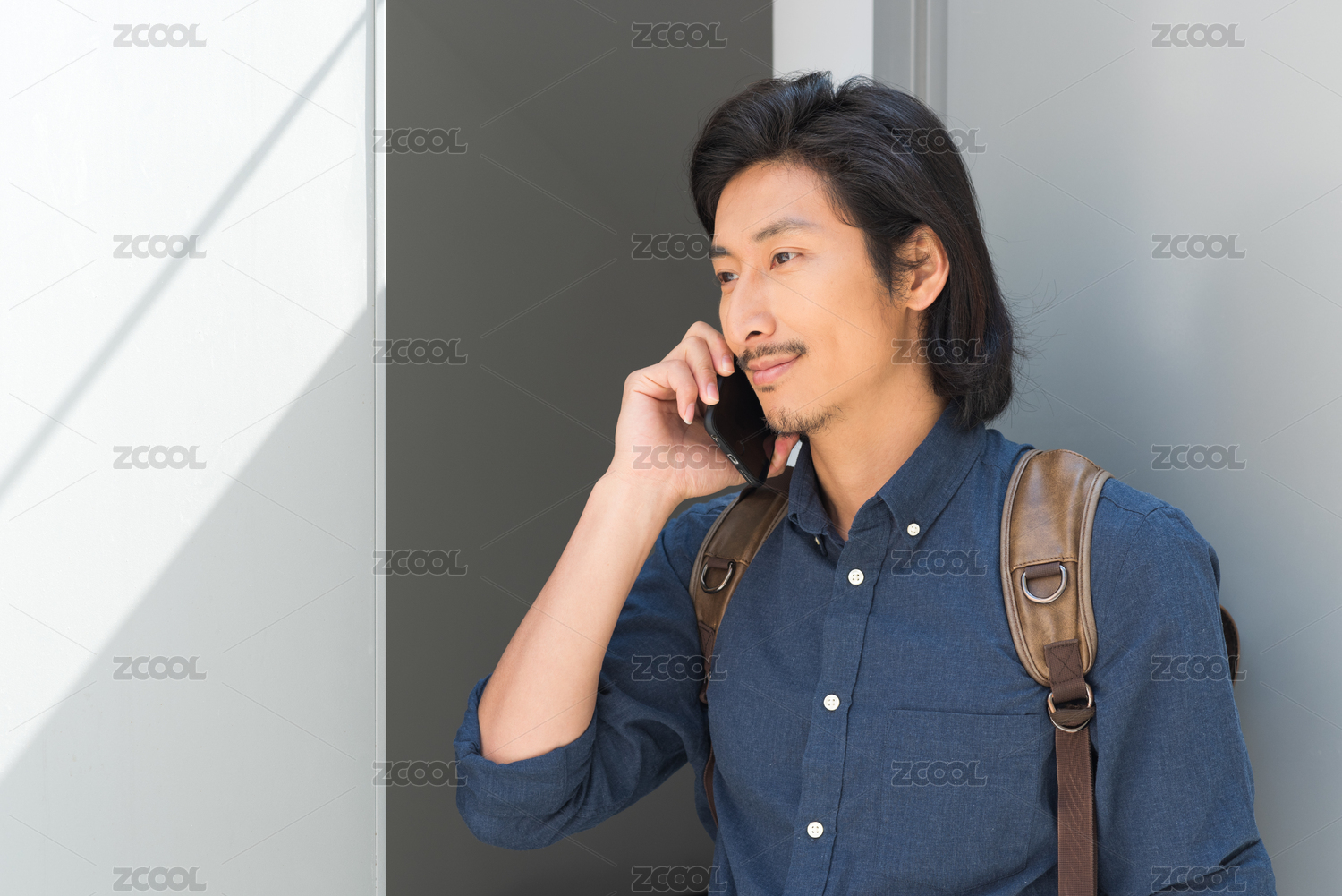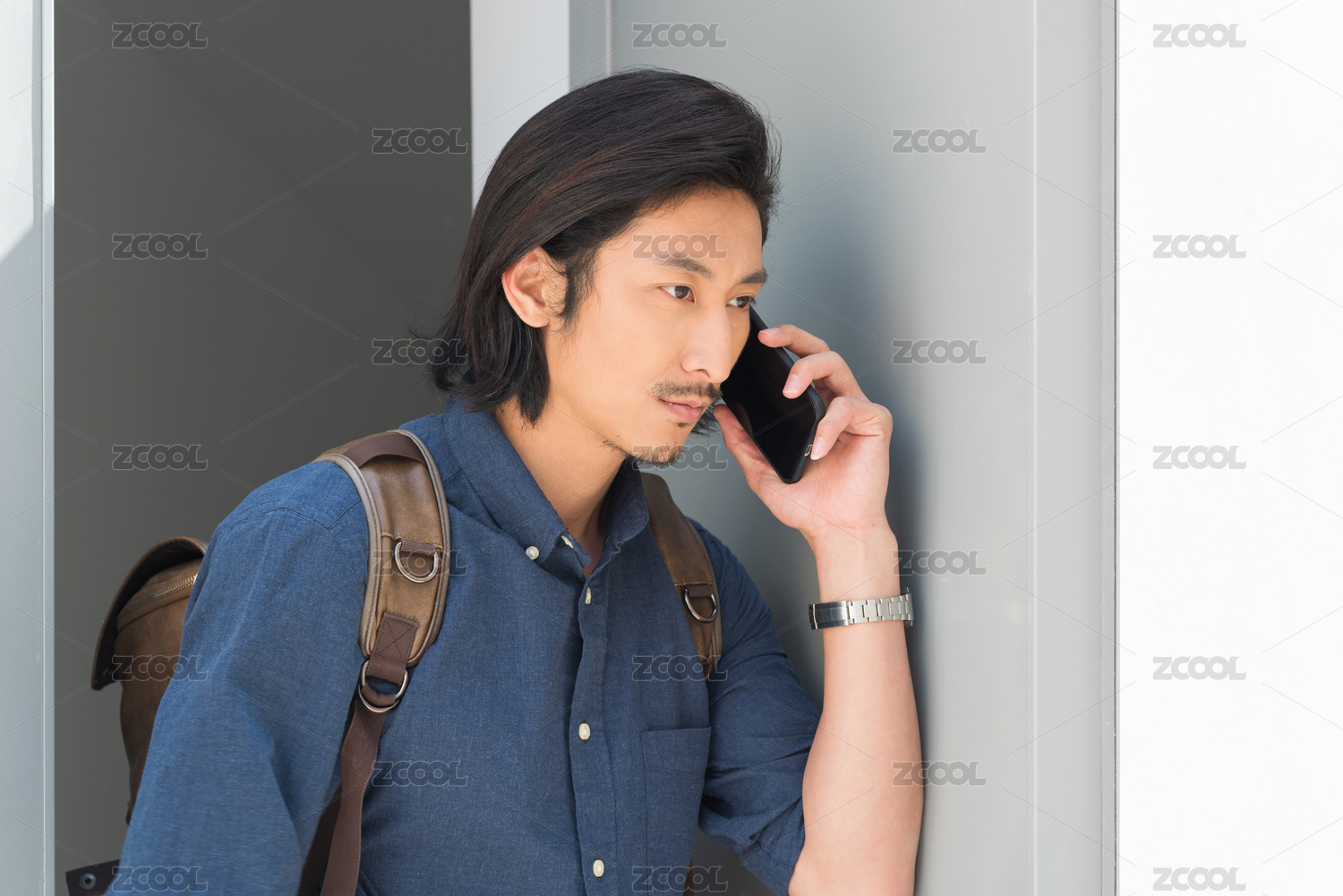 亚裔商务男士在写字楼玻璃窗旁使用手机