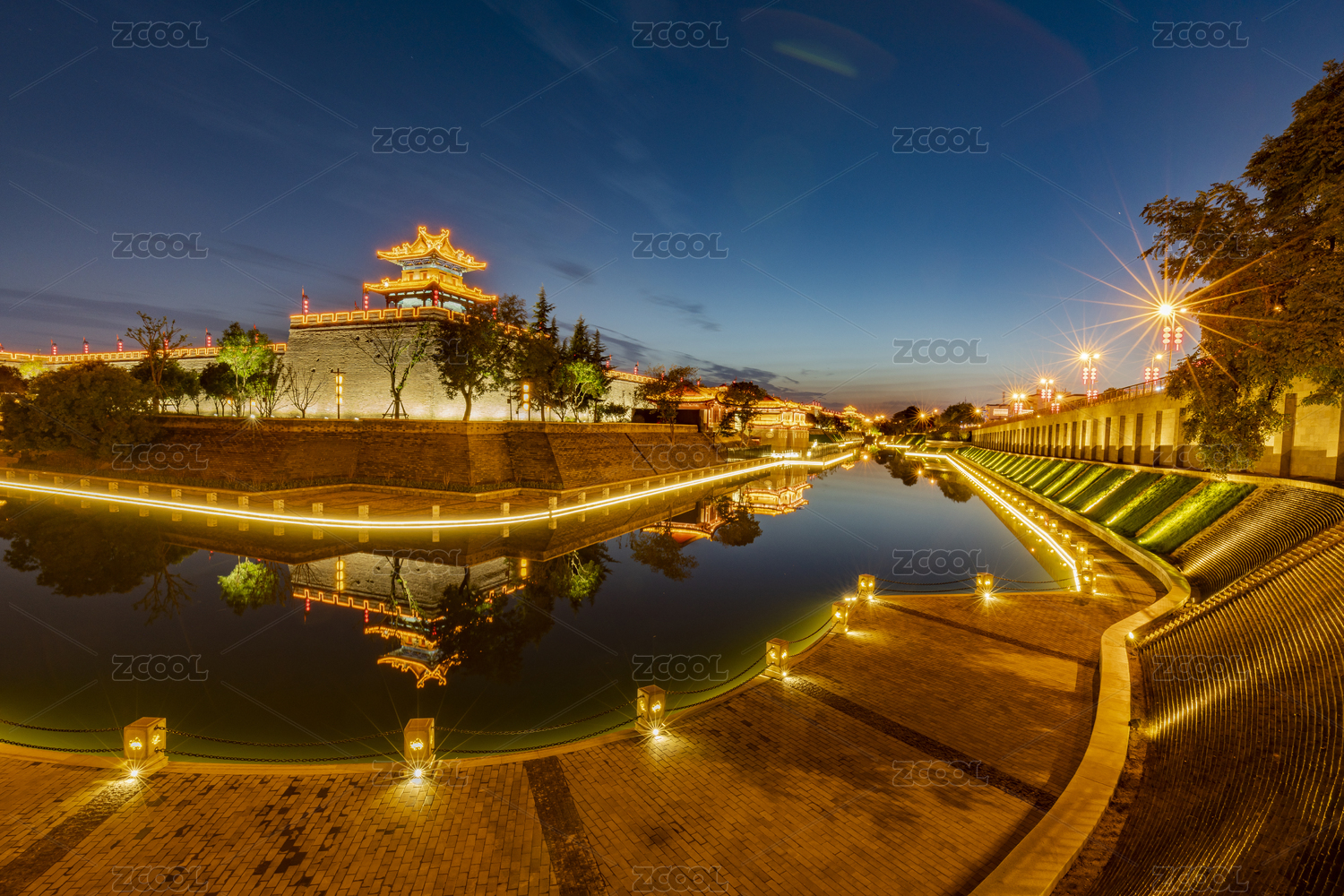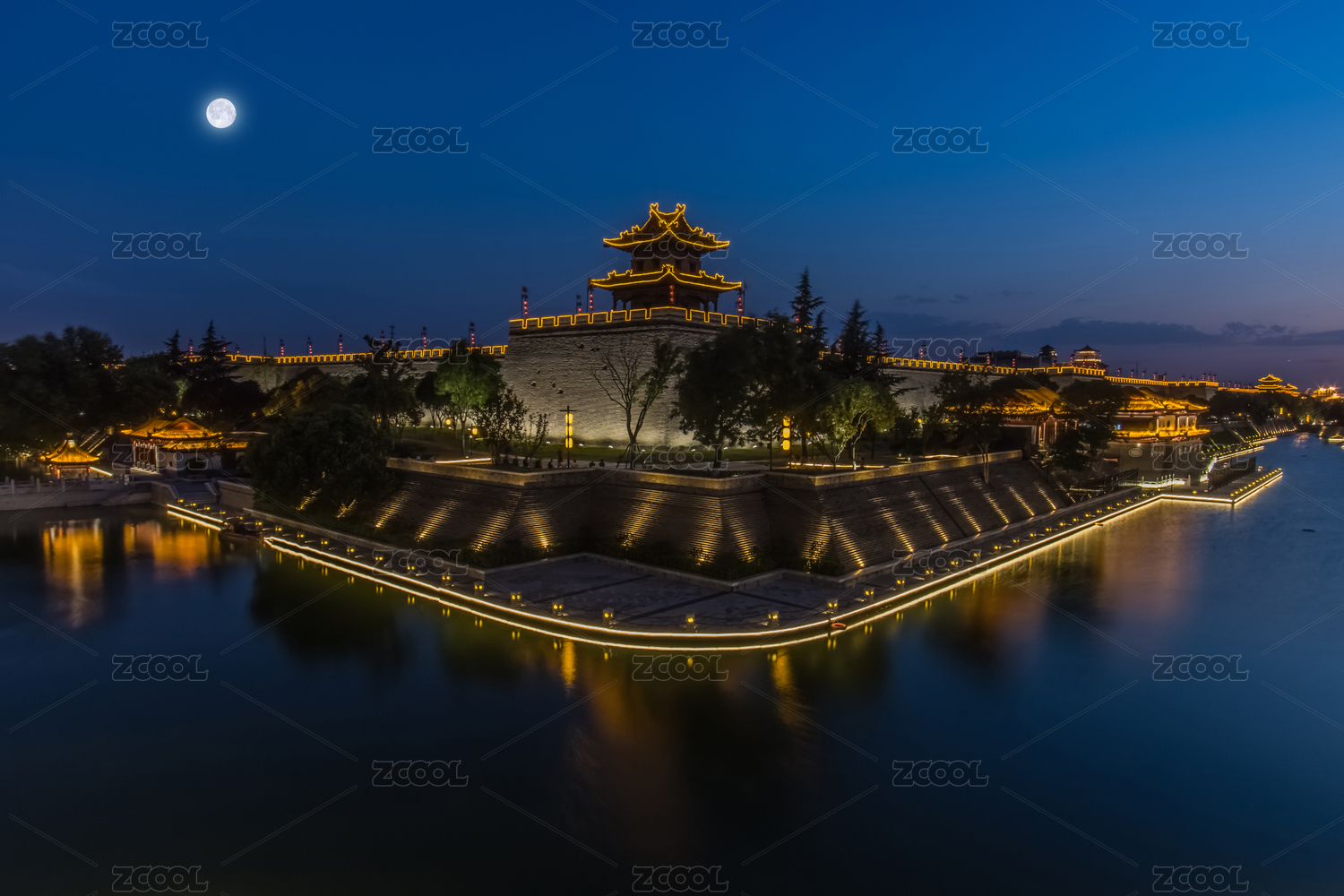 陕西省西安市夜晚月亮光照古城墙角楼建筑