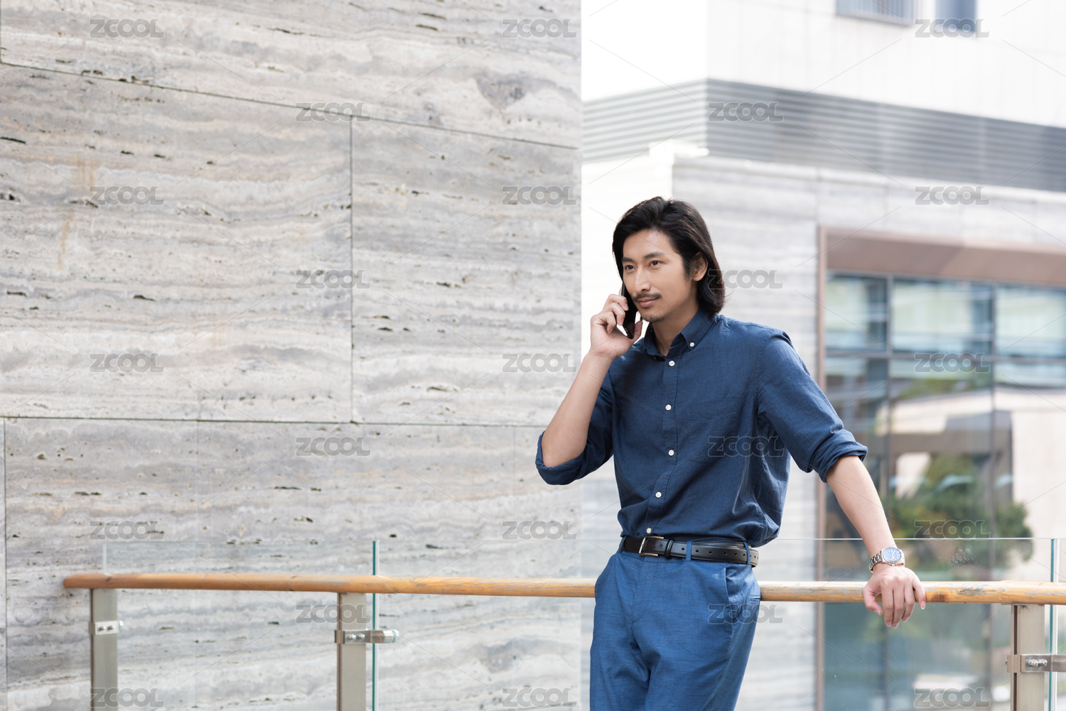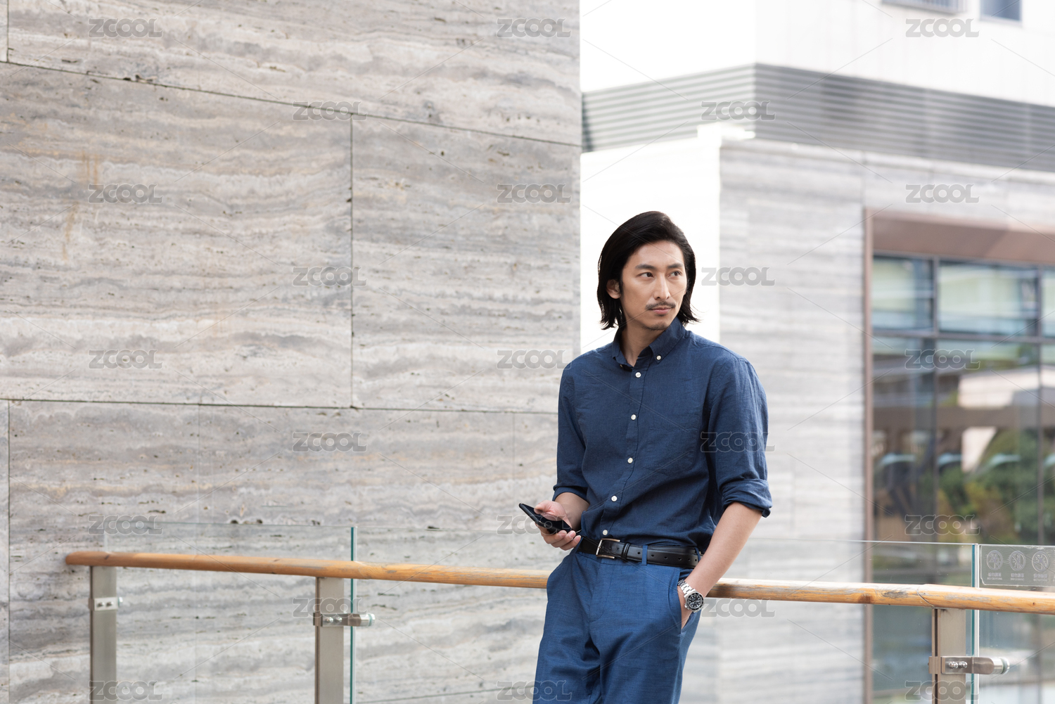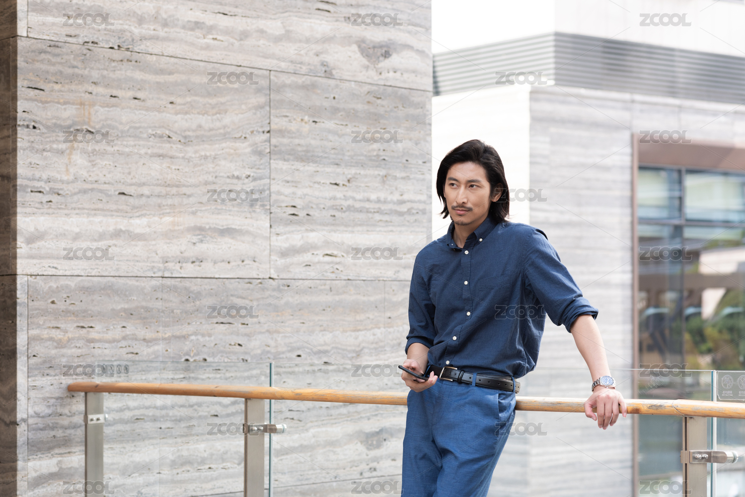 年轻商务男士拿着手机倚靠在栏杆上