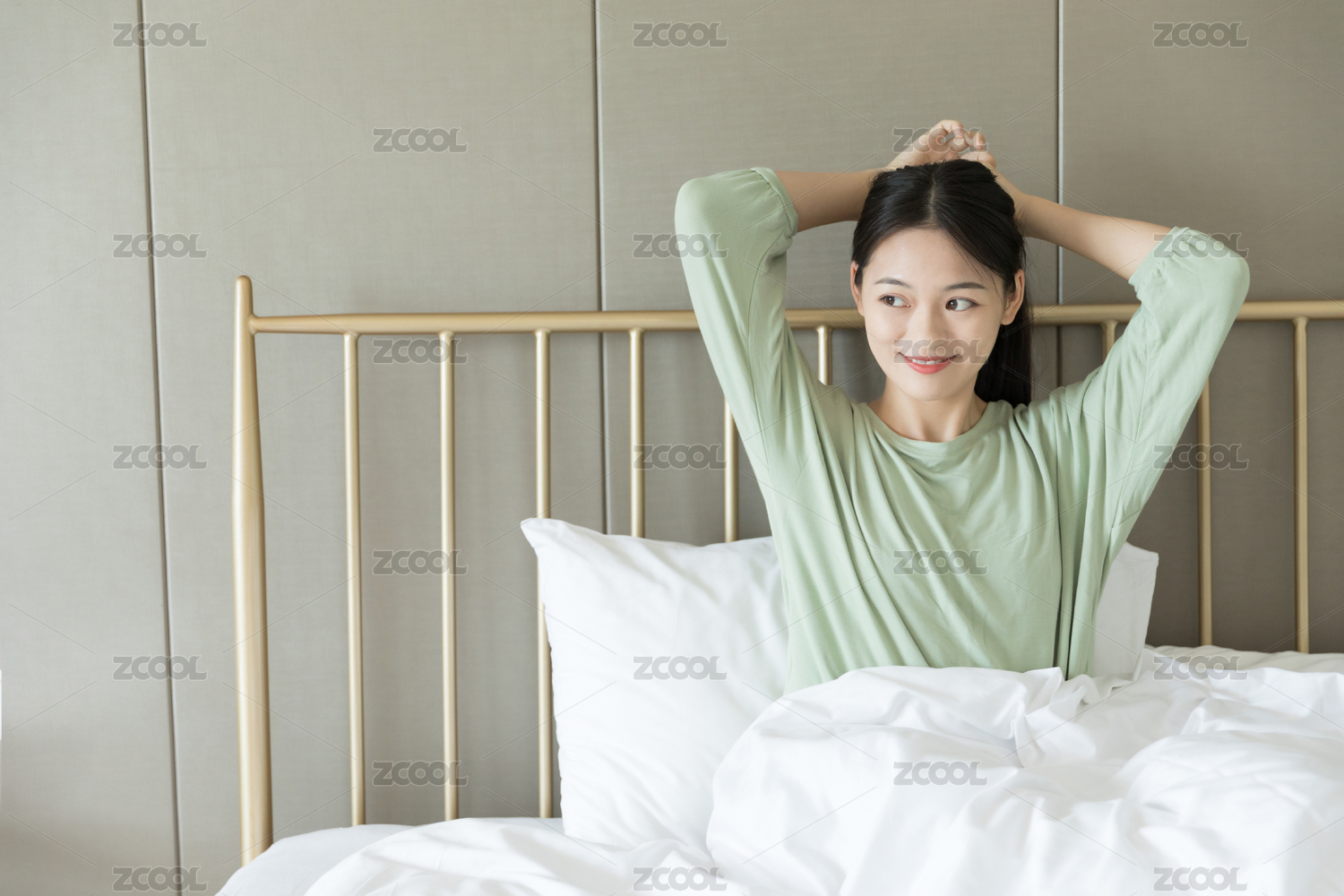 年轻女性早晨睡醒坐在床上双臂伸展开拉伸身体