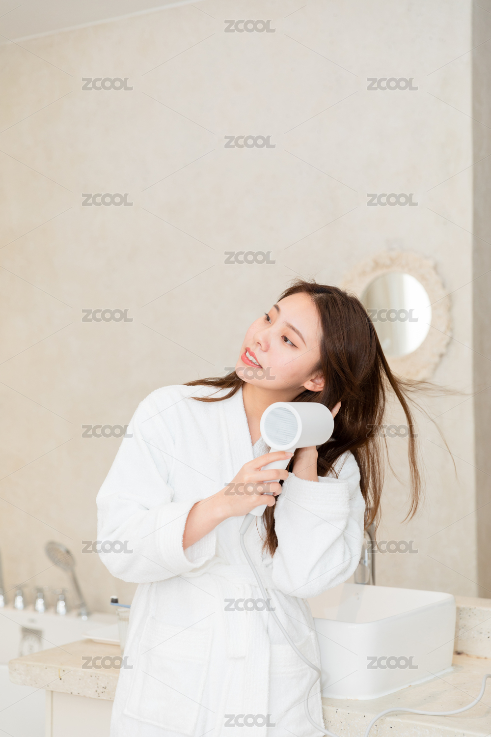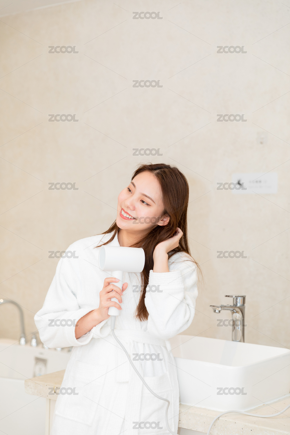 美女,微笑,开心,浴袍,沐浴,洗头,吹头发,吹风机,吹,美容