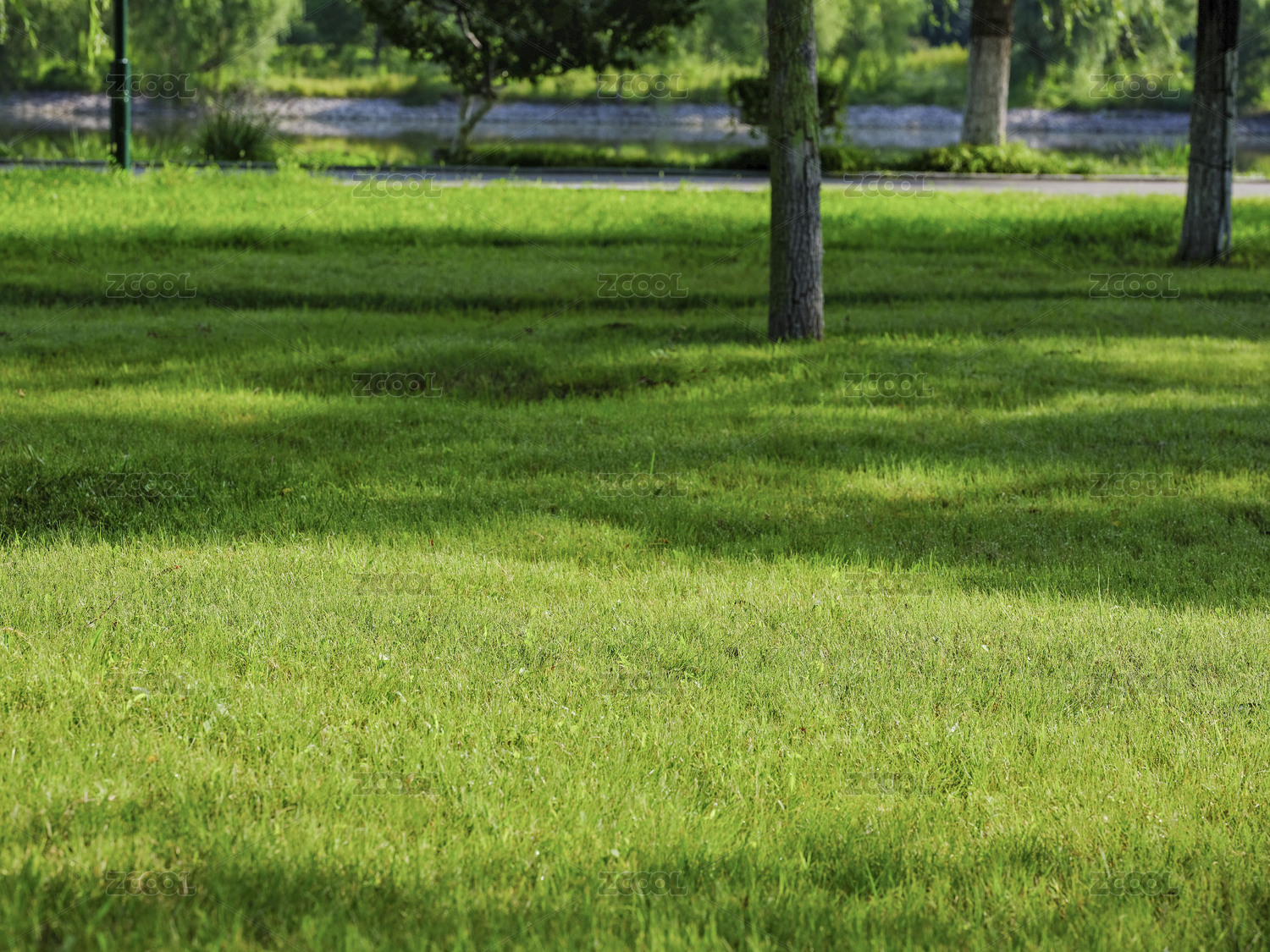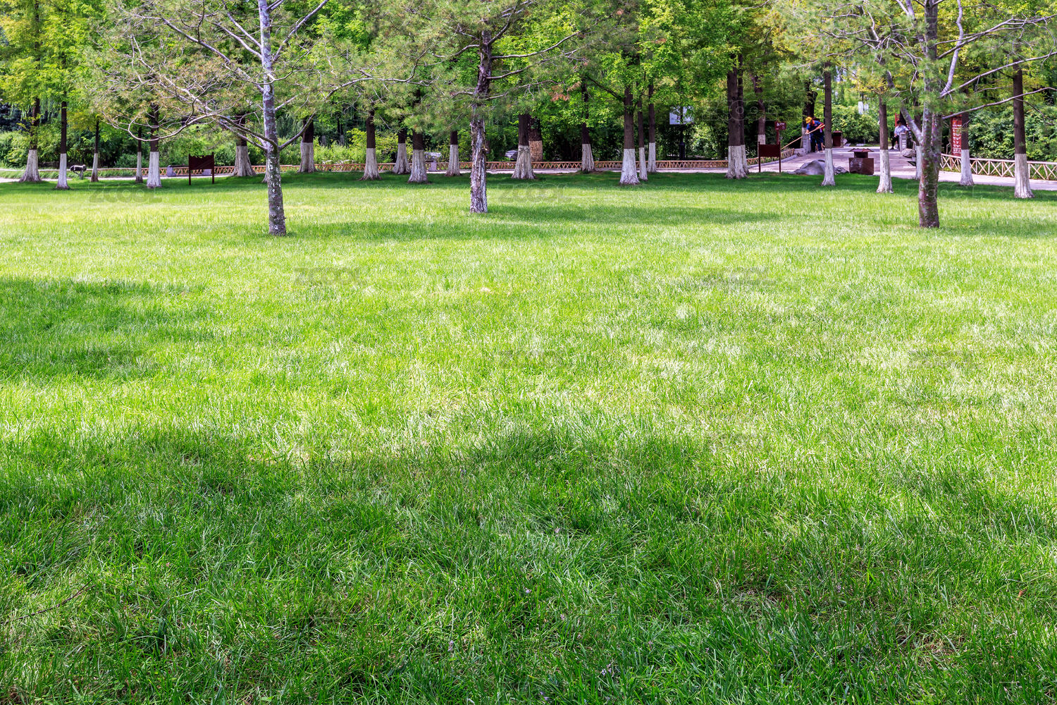 中国山东省济南市五龙潭公园内的阳光绿树草坪自然风光