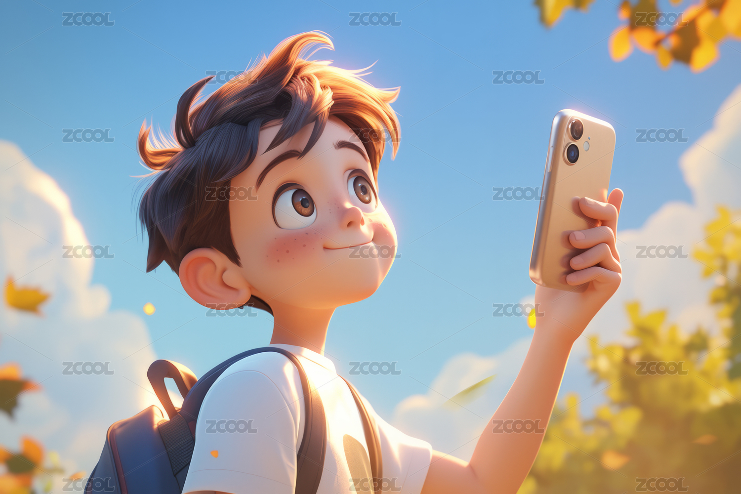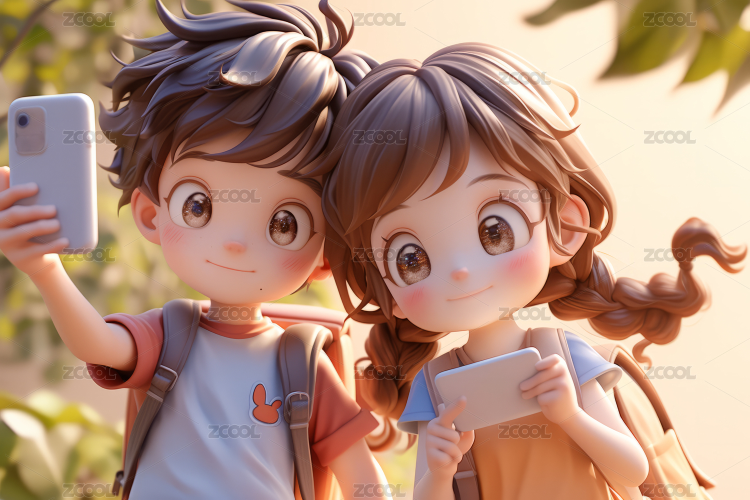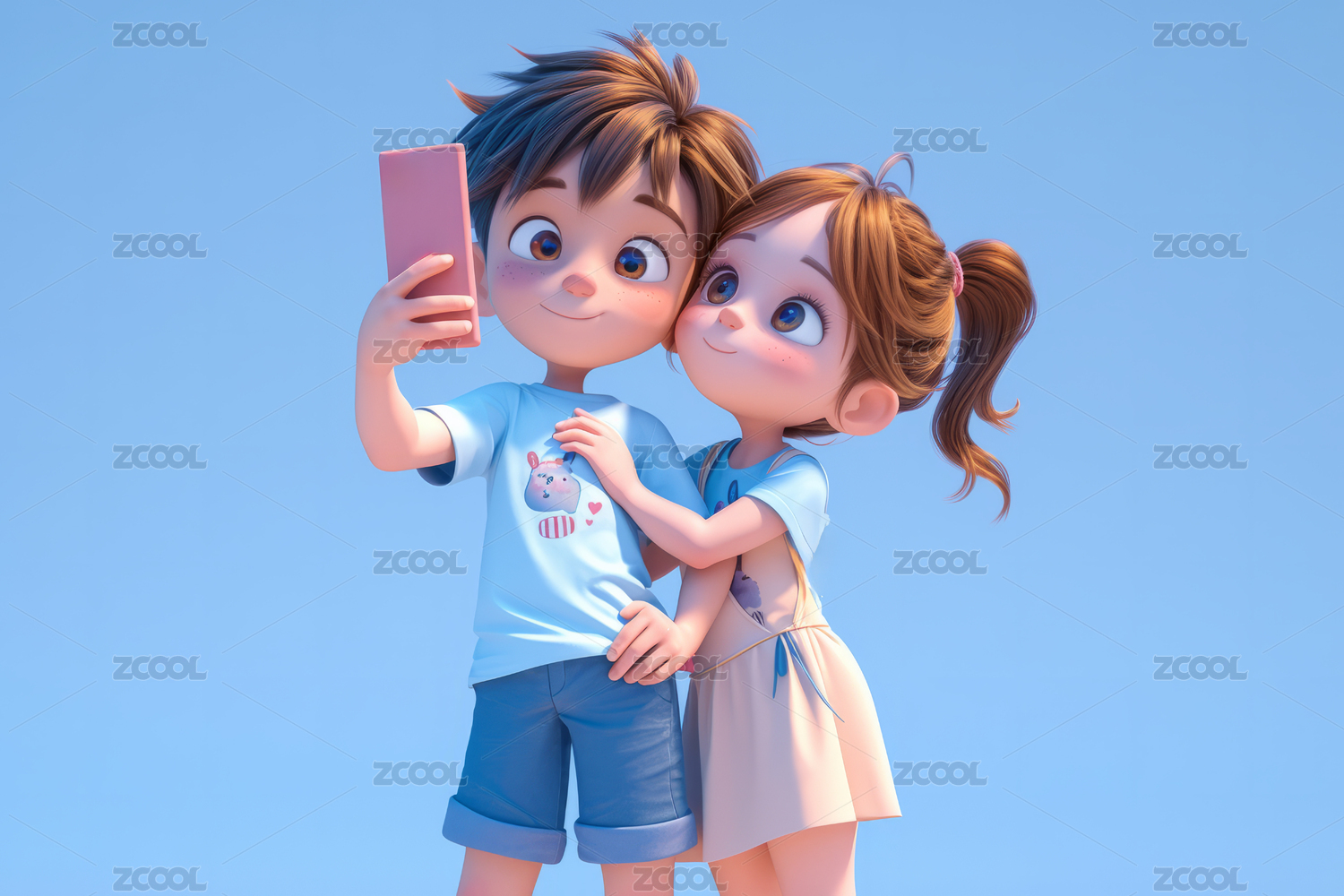 卡通,3D,可爱,情侣,手机,自拍,户外,插画,aigc,两个人