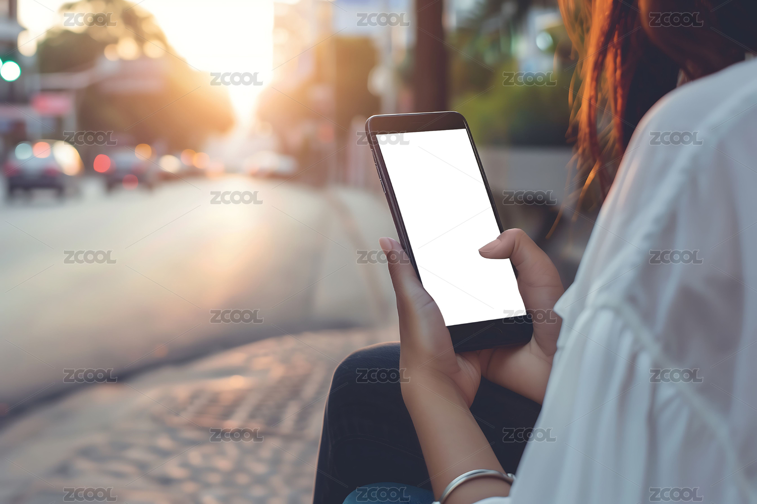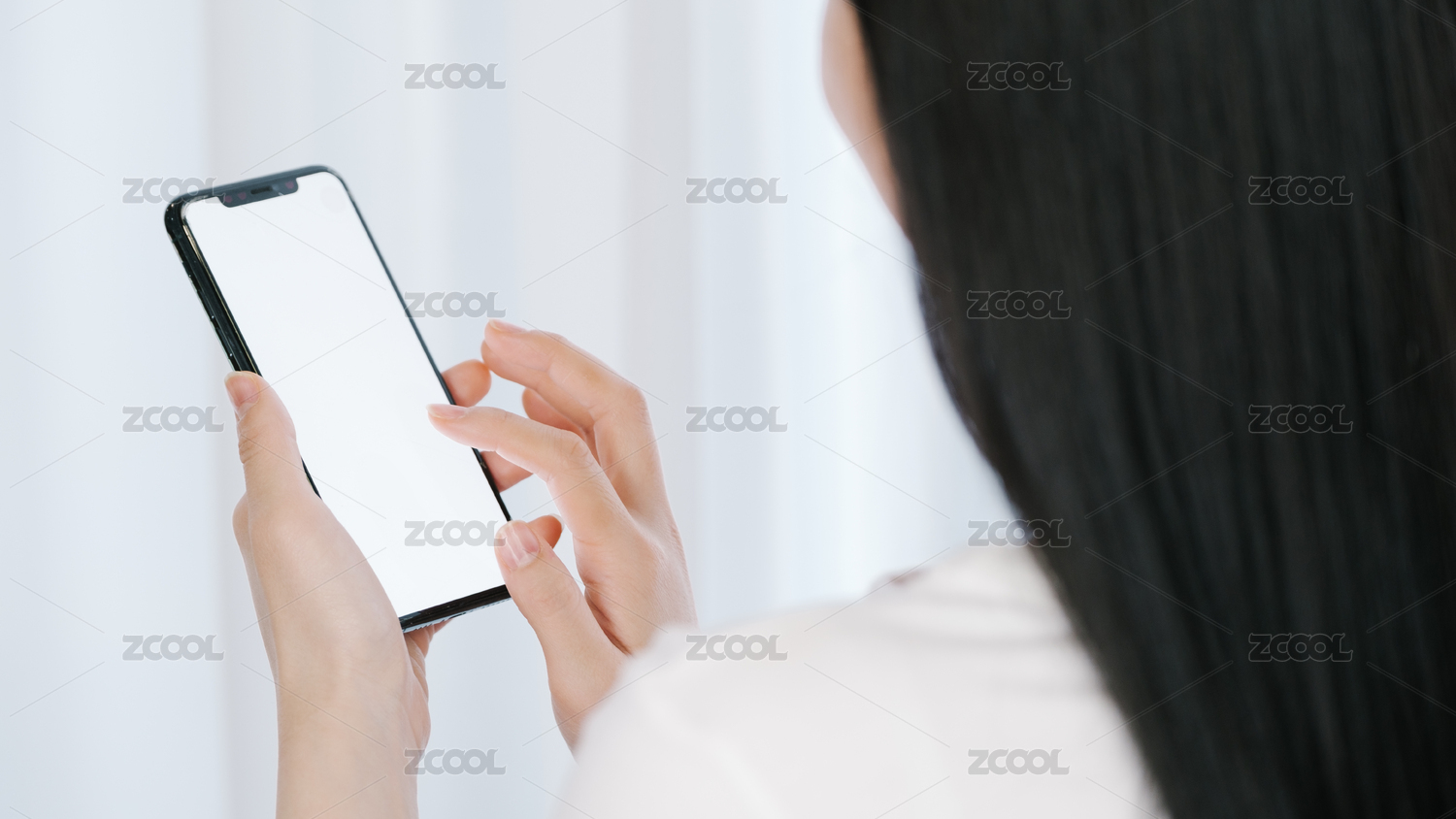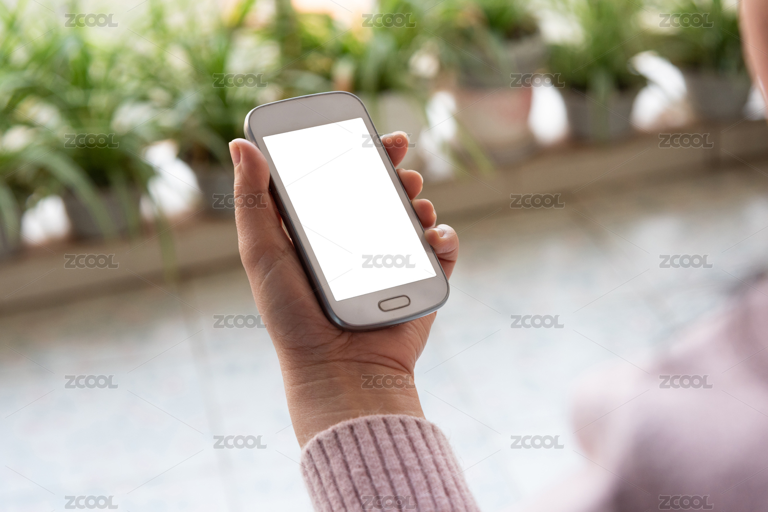 咖啡馆里女性手拿空白屏幕手机玩手机