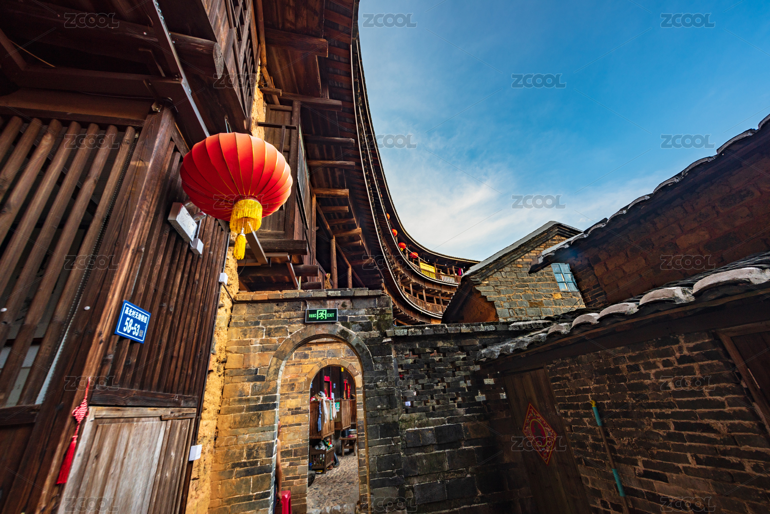 挂有灯笼的砖砌土楼内景,中国福建永定